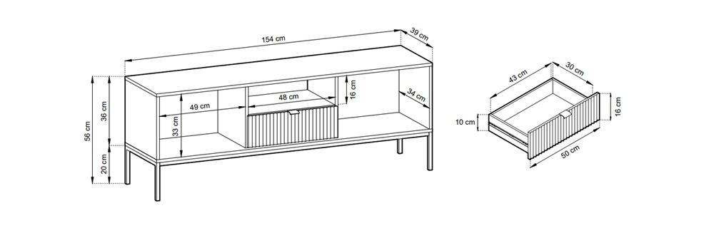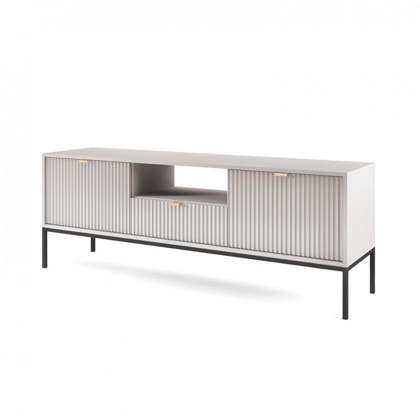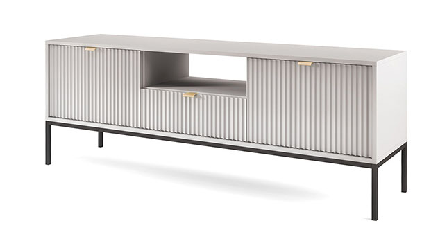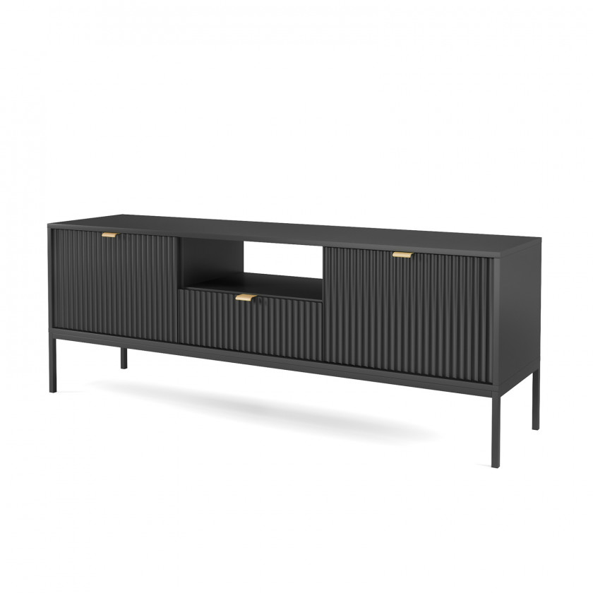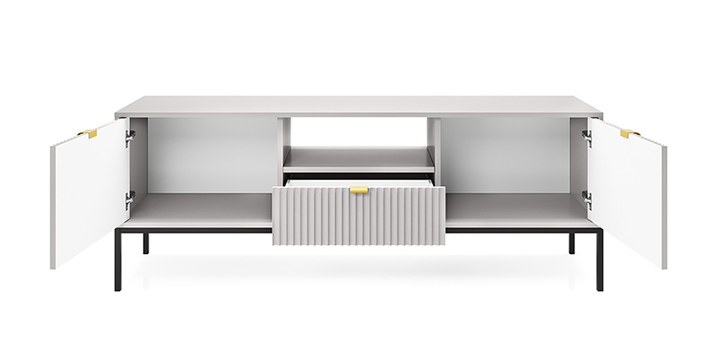 Träumen Sie von einer modernen und dennoch minimalistischen Einrichtung mit einem Hauch von Raffinesse? Oder möchten Sie Ihre Wohnung so einrichten, dass sie aussieht, als käme sie aus einem Einrichtungsmagazin? Wir haben etwas für Sie! Das Kari-System ist die Essenz von Eleganz, Stil, Harmonie und einzigartigem Design. Die Kombination aus schwarzem Metallsockel und klassischer Dekorfarbe verleiht Ihrem Interieur eine einzigartige und angenehme Atmosphäre. Diese Kollektion eignet sich perfekt für Loft-, Industrie- und modernistische Einrichtungen. Der TV-Schrank Kari RTV154 verfügt über zwei Türfronten, die beim Öffnen einen funktionalen Stauraum und eine geräumige Schublade freigeben, mit der Sie den Raum organisieren können. Der Korpus des Möbels steht auf einem Metallsockel und hohen Beinen. Das einzigartige Design wird durch geriffelte Fronten und goldene Griffe ergänzt.