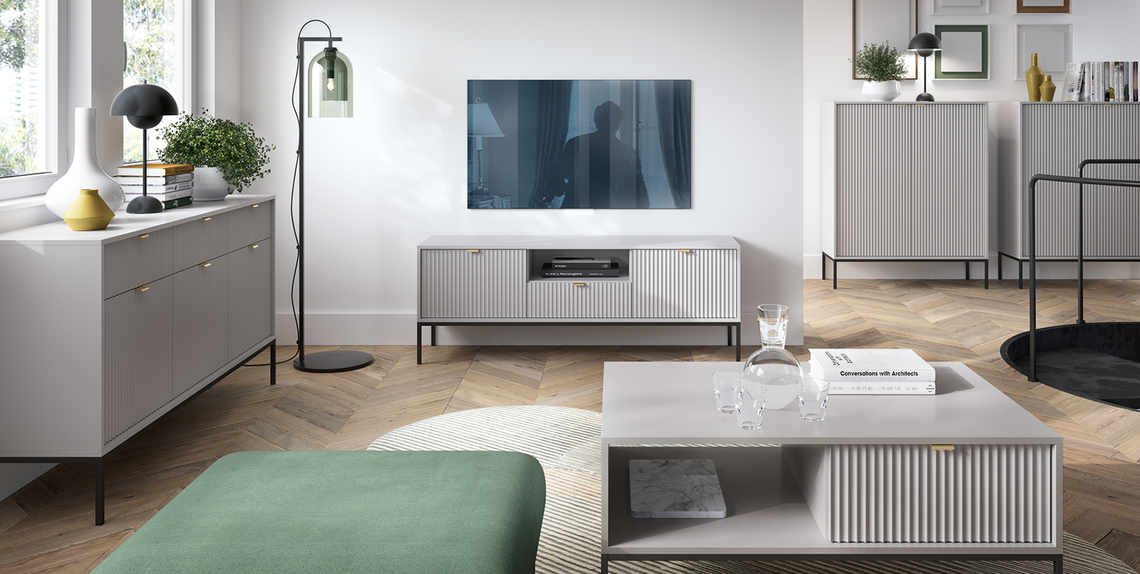 Träumen Sie von einer modernen und dennoch minimalistischen Einrichtung mit einem Hauch von Raffinesse? Wir haben etwas für Sie! Das Kari-System ist die Essenz von Eleganz, Stil, Harmonie und einzigartigem Design. Der Korpus des Frisiertischs Kari T104 ruht auf einem Metallsockel und hohen Beinen. Das einzigartige Gesamtdesign wird durch geriffelte Fronten und goldene Griffe ergänzt.