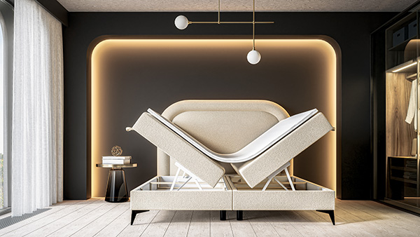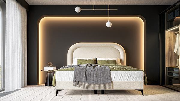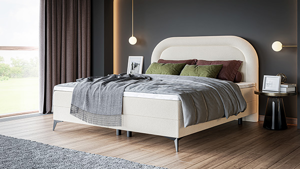 Bett MISTY mit elegantem halbrunden Kopfteil. Die abgerundeten Formen des Kopfteils sind nicht nur ein ästhetisches Gestaltungselement, sondern bieten auch Halt für Kopf und Rücken beim Lesen, Entspannen oder Fernsehen im Bett. Darüber hinaus betonen hohe Beine die Leichtigkeit der Struktur, wodurch ein angenehmer optischer Effekt entsteht und die Sauberkeit des Bettes erleichtert wird. Jedes Detail des MISTY-Bettes wurde sorgfältig durchdacht, um maximalen Nutzungskomfort zu gewährleisten. Mit der Wahl dieses Bettes investieren Sie in ein einzigartiges Schlafzimmerdesign und ungestörten Schlaf.