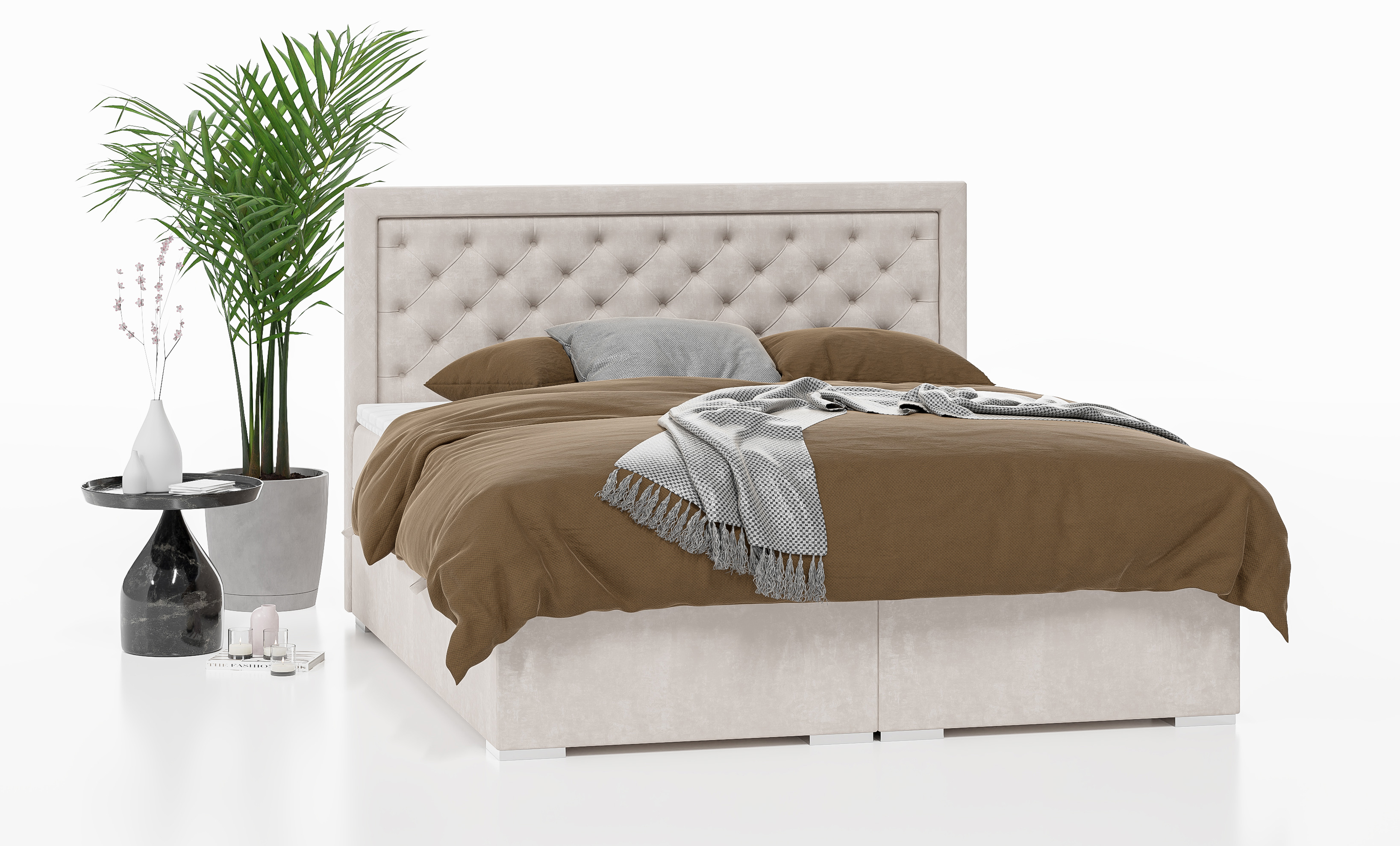 Das Boxspringbett GLAMI verfügt über dekorative Steppungen am gesamten Kopfteil, die ihm einen außergewöhnlichen Charme und eine Eleganz verleihen, typisch für den Glamour-Stil. Sein einzigartiges Design begeistert und macht es nicht nur zu einem Schlafmöbel, sondern auch zu einem attraktiven dekorativen Element im Schlafzimmer. Hergestellt aus Materialien höchster Qualität, strahlt das Bett GLAMI Luxus und Komfort aus.