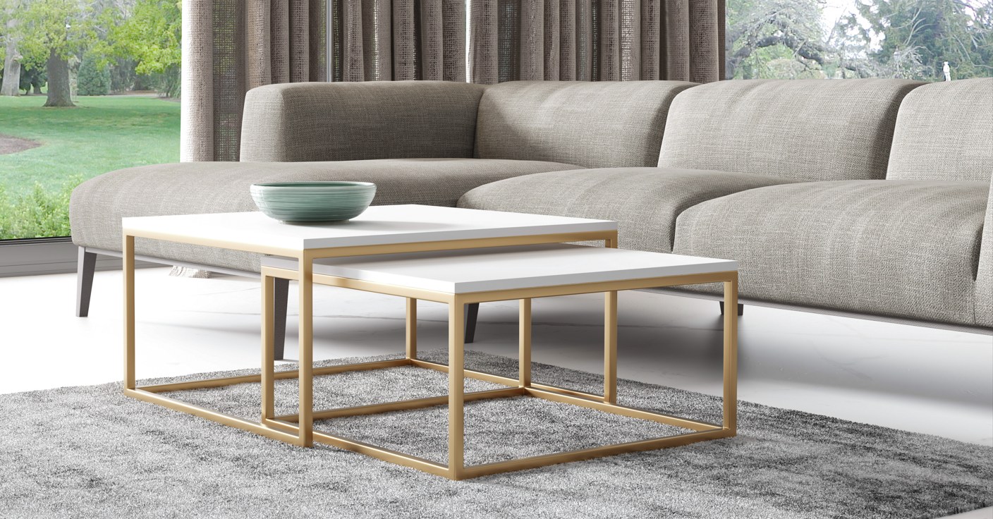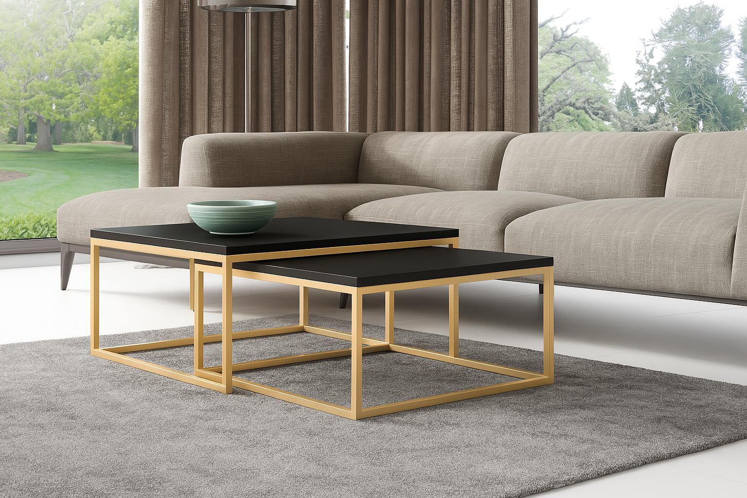 Quadratischer 2-in-1-Couchtisch im modernen Stil, gefertigt mit viel Liebe zum Detail. Das Gestell besteht aus pulverbeschichtetem Metall, während die Tischplatte aus einer laminierten Platte gefertigt ist, die sich durch eine hohe Widerstandsfähigkeit gegenüber mechanischen Beschädigungen auszeichnet.