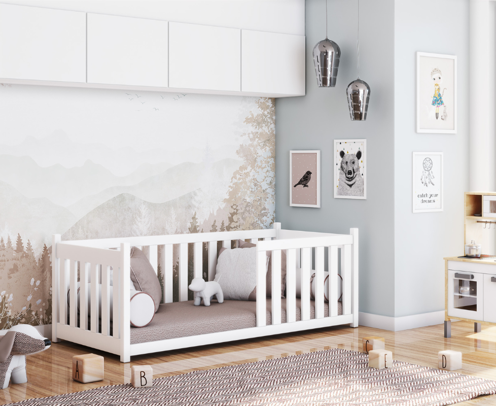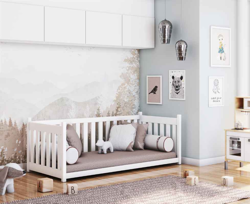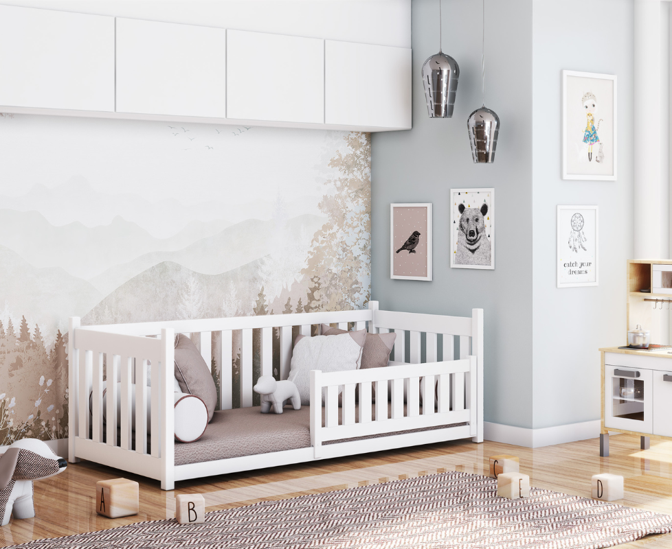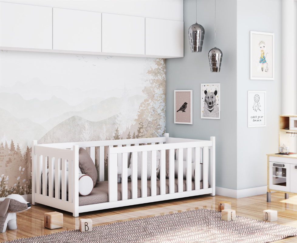 Das Bett ist in mehreren Größen und Farben erhältlich, sodass es individuell an Ihre Bedürfnisse und den Stil des Raumes angepasst werden kann. Ob Naturholz, Weiß, Grau oder zarte Pastelltöne – Sie entscheiden, was am besten passt. Ein besonderes Highlight ist die Wahlmöglichkeit bei den Rausfallschutz-Varianten. Sie können zwischen einem vollständigen, teilweisen oder offenen Seitenschutz wählen – ideal für verschiedene Altersstufen und Entwicklungsphasen Ihres Kindes.