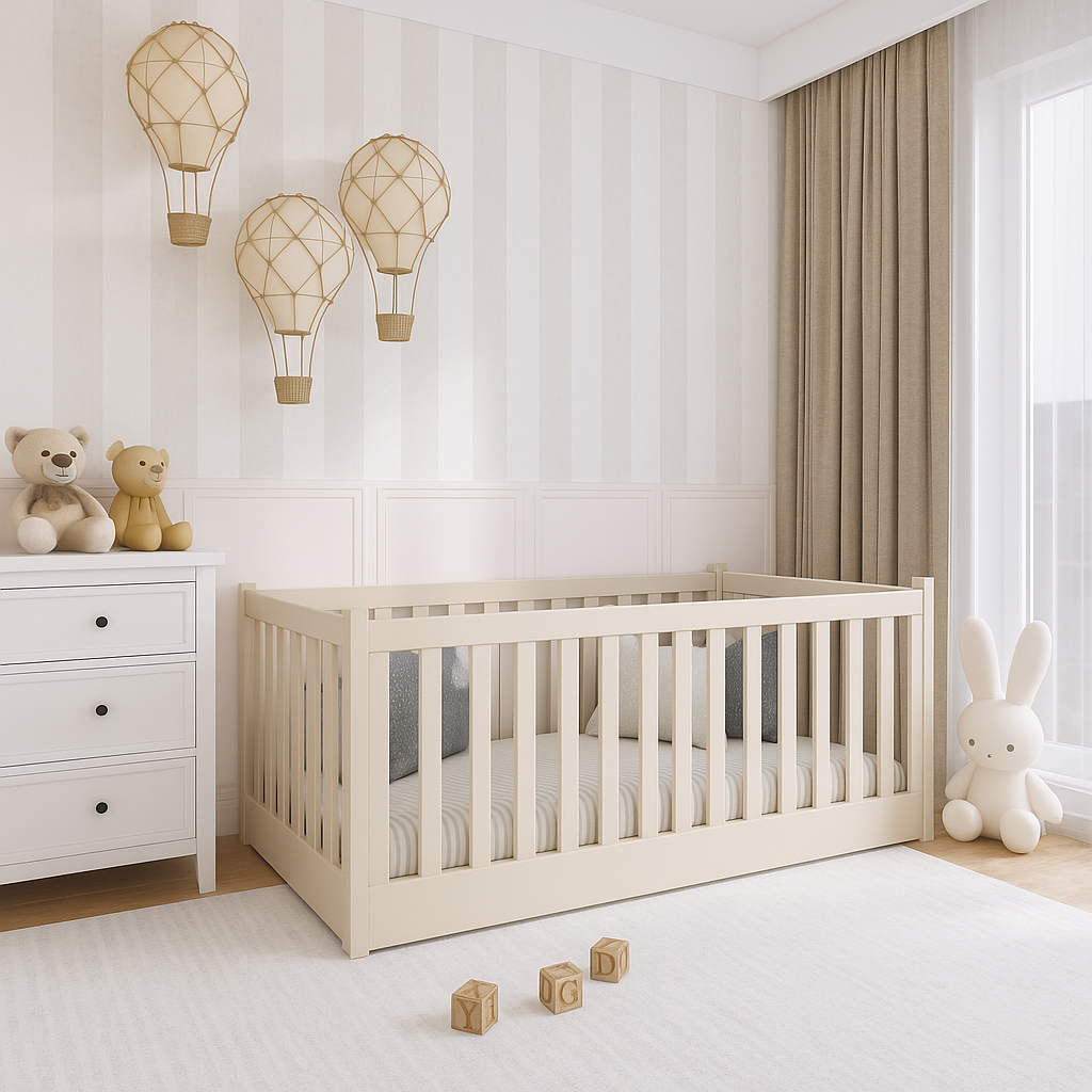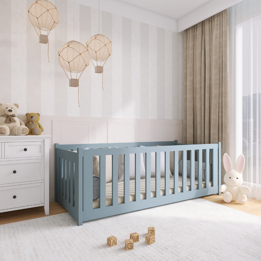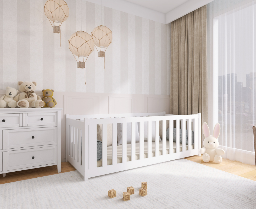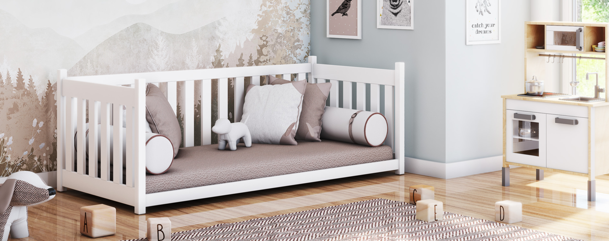 Das Bett ist in mehreren Größen und Farben erhältlich, sodass es individuell an Ihre Bedürfnisse und den Stil des Raumes angepasst werden kann. Ob Naturholz, Weiß, Grau oder zarte Pastelltöne – Sie entscheiden, was am besten passt. Ein besonderes Highlight ist die Wahlmöglichkeit bei den Rausfallschutz-Varianten. Sie können zwischen einem vollständigen, teilweisen oder offenen Seitenschutz wählen – ideal für verschiedene Altersstufen und Entwicklungsphasen Ihres Kindes.