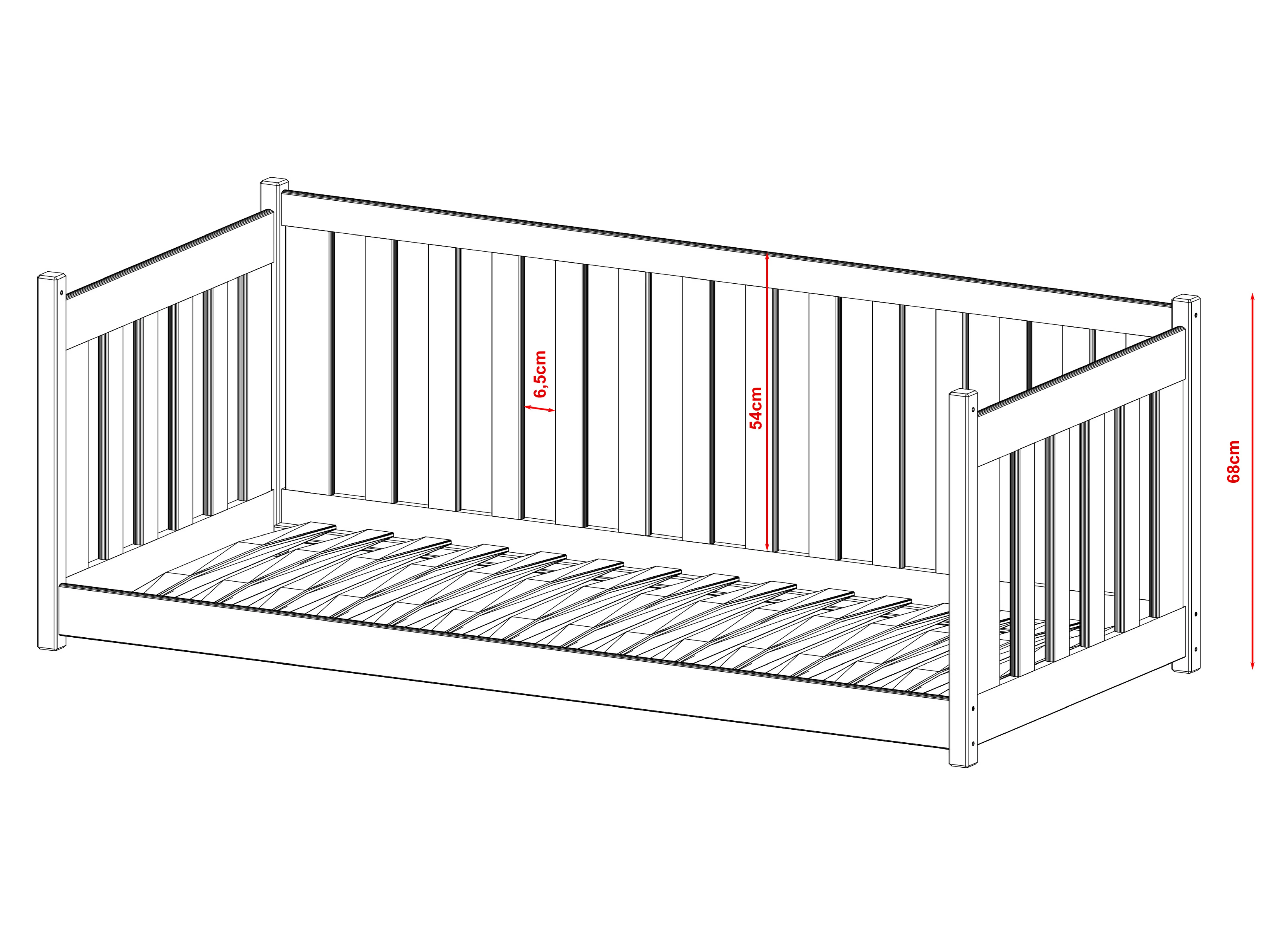 Ein stilvolles Kinderbett aus natürlichem Kiefernholz, das sich sowohl in klassische als auch moderne Kinderzimmer harmonisch einfügt. Dank der Möglichkeit, zwischen verschiedenen Rausfallschutz-Varianten zu wählen (vollständig, teilweise oder offen), wächst das Bett mit dem Kind mit und passt sich seinen Bedürfnissen an. Die stabile Konstruktion garantiert Langlebigkeit, während die sorgfältig abgerundeten Kanten für Sicherheit im Alltag sorgen.