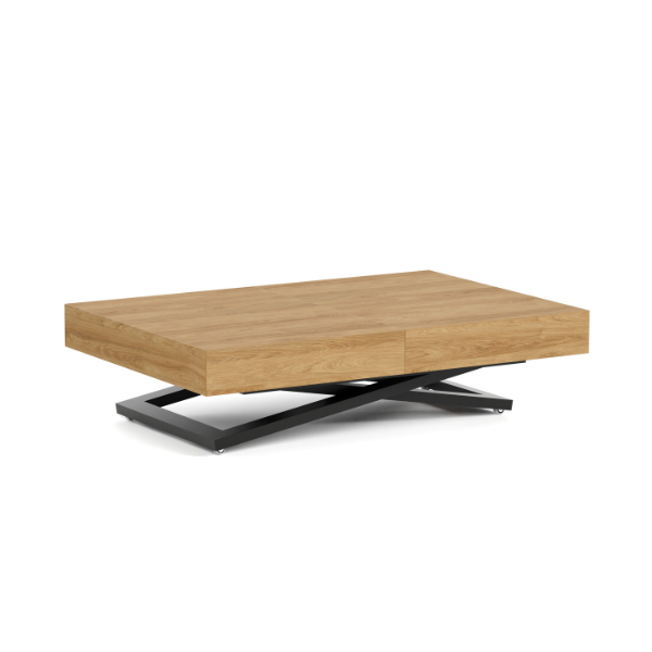 Die elegante Kombination aus Holzoptik und schwarzem Metallgestell macht diesen Verwandlungstisch zu einem echten Hingucker in jedem Wohnbereich.