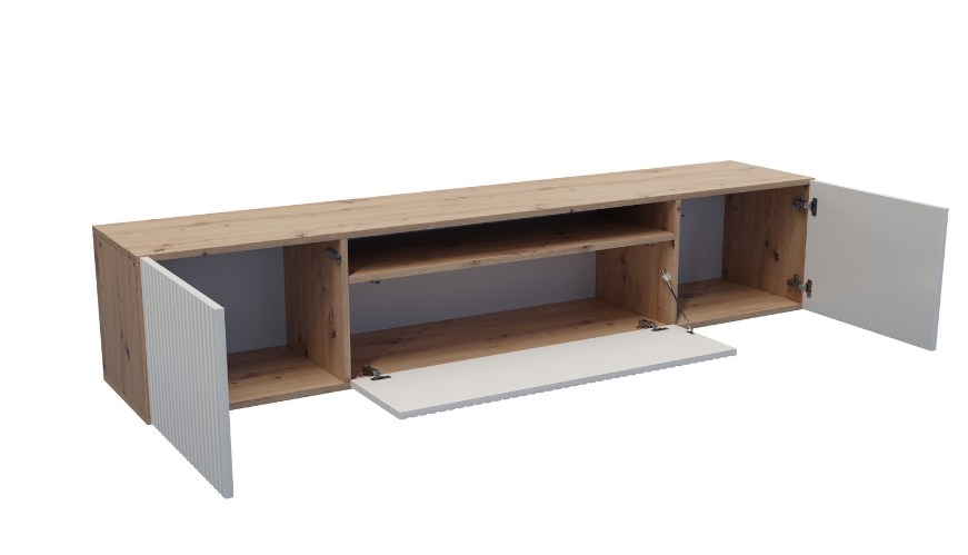Stilvolles, wandhängendes TV-Lowboard mit eleganter gerillter MDF-Front (18 mm stark). Die Korpuskonstruktion besteht aus strapazierfähiger, laminierter Platte. Die Türen öffnen sich dank moderner Push-to-Open-Funktion – ganz ohne Griffe. Das perfekte Zusammenspiel aus Funktionalität und zeitlosem Design für Ihr Wohnzimmer.