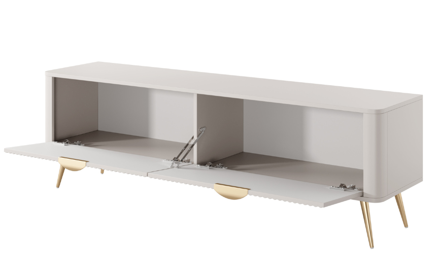 Träumen Sie von einem modernen, minimalistischen Interieur mit einem Hauch von Eleganz? Wir haben etwas für Sie! Das LATE-System ist die Quintessenz von Eleganz, Stil, Harmonie und einzigartigem Design. Der TV-Schrank ruht auf hohen Metallbeinen und sein einzigartiges Design wird durch gerippte Fronten betont.
