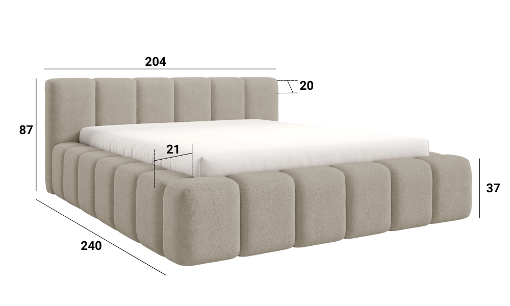 Das Bett KALLA PREMIUM vereint modernes Design, außergewöhnlichen Komfort und praktische Funktionalität. Seine weiche, gepolsterte Form mit markanten Steppnähten verleiht dem Raum Eleganz und eine gemütliche Atmosphäre. Bezogen mit hochwertigem, weichem Stoff Bouclé QUELLE oder Chenille PERFECT HARMONY, begeistert es sowohl durch seine Optik als auch durch die angenehme Haptik, die zudem alltagstauglich und strapazierfähig ist.
