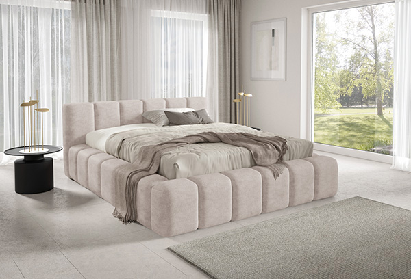 Das Bett KALLA PREMIUM vereint modernes Design, außergewöhnlichen Komfort und praktische Funktionalität. Seine weiche, gepolsterte Form mit markanten Steppnähten verleiht dem Raum Eleganz und eine gemütliche Atmosphäre. Bezogen mit hochwertigem, weichem Stoff Bouclé QUELLE oder Chenille PERFECT HARMONY, begeistert es sowohl durch seine Optik als auch durch die angenehme Haptik, die zudem alltagstauglich und strapazierfähig ist.