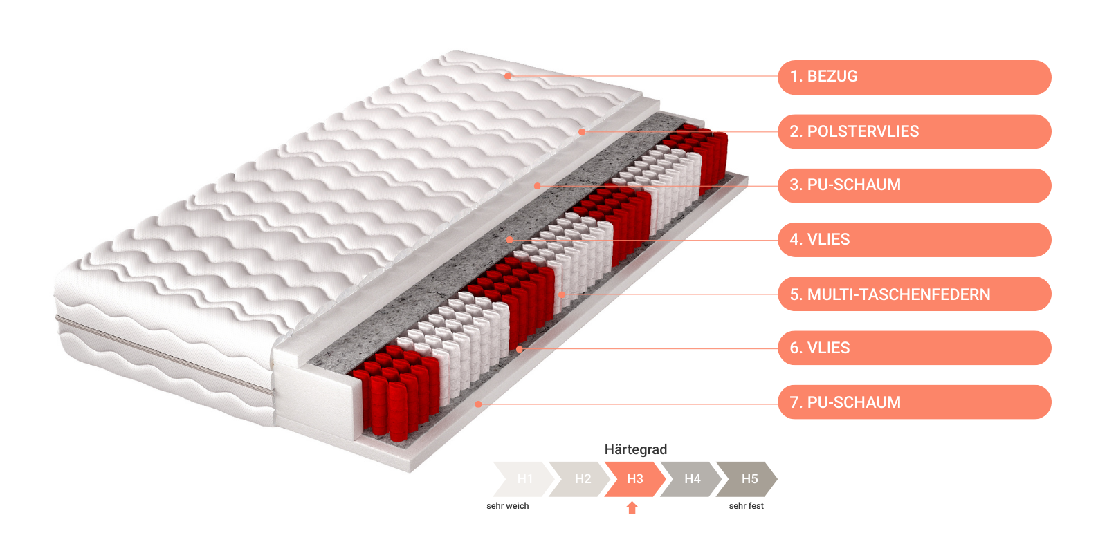 Achtung! Die Lieferzeit von bis zu 7 Werktagen gilt ausschließlich für Matratzen in den Größen 140x200 cm, 160x200 cm und 180x200 cm. Alle anderen Größen sind mit einer Lieferzeit von ca. 2–3 Wochen erhältlich.