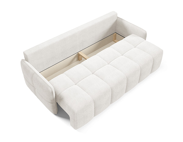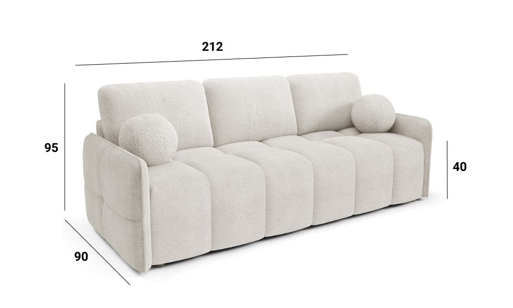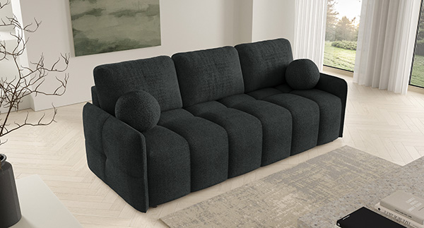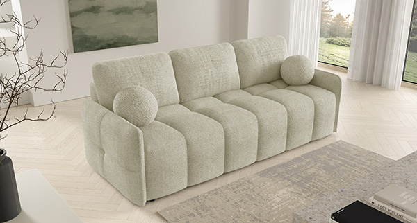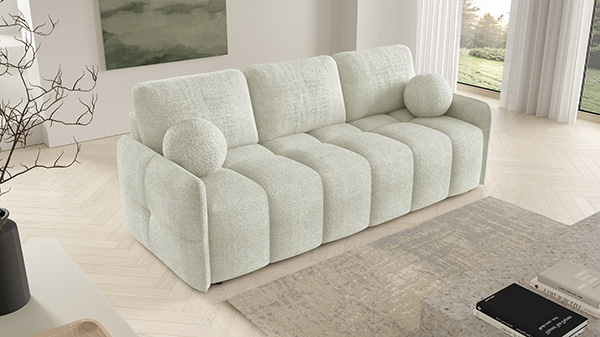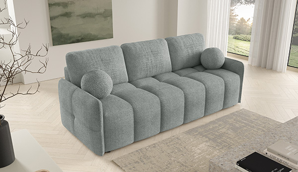 Das Sofa Evi ist ein elegantes und modernes Möbelstück, das sich durch seine weiche, gesteppte Form und außergewöhnlichen Nutzungskomfort auszeichnet. Sein charakteristisches Merkmal sind die breiten Sitzflächen, die in deutlich erkennbare Module unterteilt sind und dem Ganzen ein rhythmisches und designorientiertes Aussehen verleihen. Die hohe, dreiteilige Rückenlehne sorgt für eine hervorragende Unterstützung des Rückens, während zusätzliche runde Zierkissen Leichtigkeit und Gemütlichkeit einbringen.