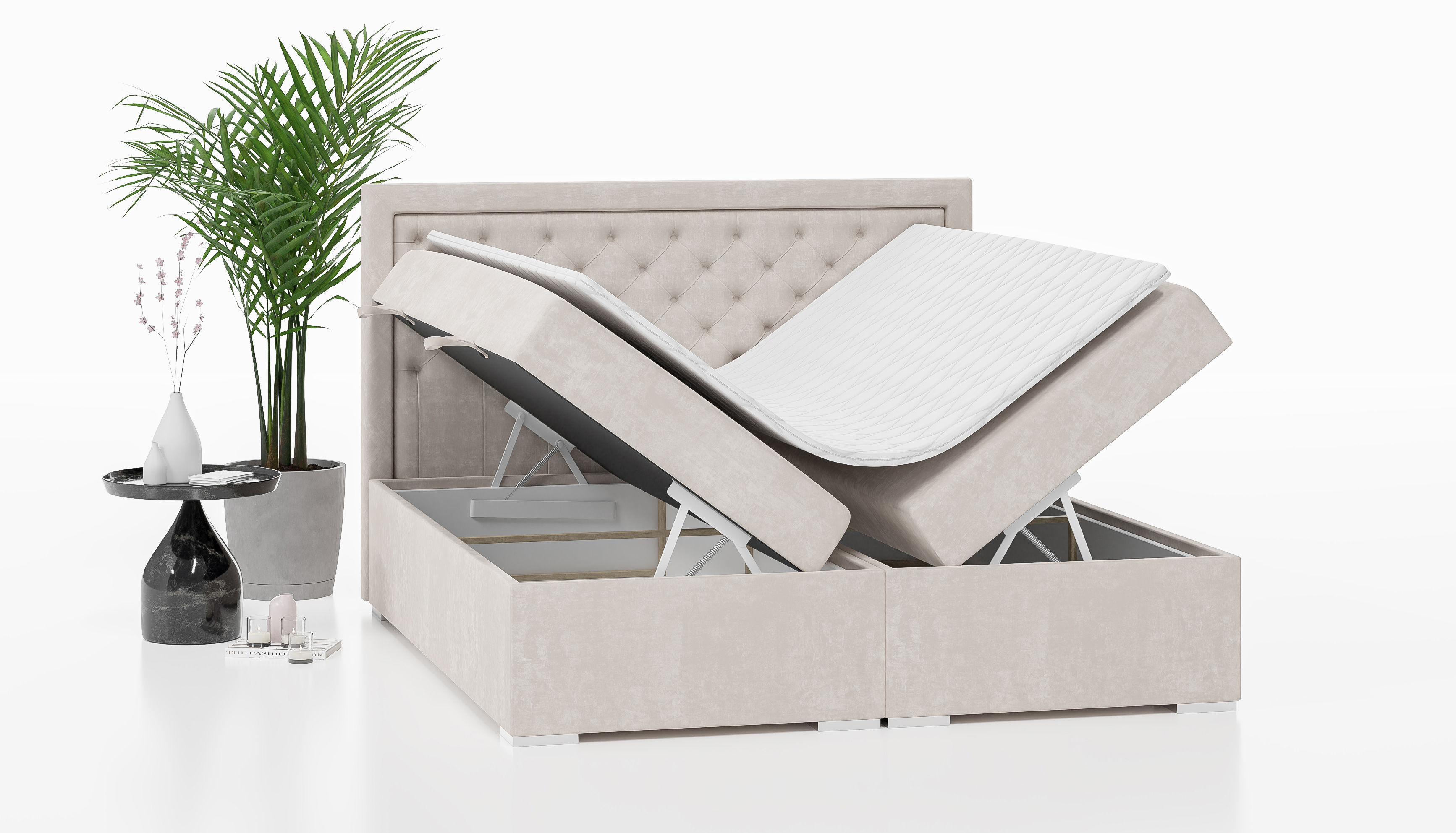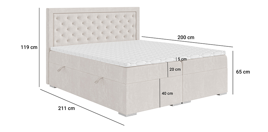 Das Boxspringbett GLAMI verfügt über dekorative Steppungen am gesamten Kopfteil, die ihm einen außergewöhnlichen Charme und eine Eleganz verleihen, typisch für den Glamour-Stil. Sein einzigartiges Design begeistert und macht es nicht nur zu einem Schlafmöbel, sondern auch zu einem attraktiven dekorativen Element im Schlafzimmer. Hergestellt aus Materialien höchster Qualität, strahlt das Bett GLAMI Luxus und Komfort aus.