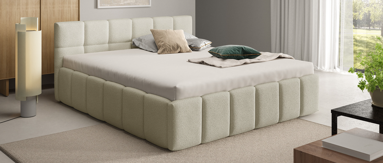 Das Polsterbett NUBO Slim ist die schmalste Variante dieses Modells und damit die perfekte Wahl für kleine, enge Schlafzimmer: Die Bettseiten messen lediglich 7 cm, wodurch Sie bei minimalem Außenmaß maximale Liegefläche erhalten. Der gepolsterte Rahmen überzeugt mit zeitloser, weicher Optik und steht in zwei hochwertigen Bezugsstoffen zur Verfügung – Chenille mit sanft-samtiger Haptik oder Bouclé mit moderner, texturierter Oberfläche. Gleichzeitig bleibt das Bett individuell konfigurierbar: Gleichzeitig bleibt das Bett individuell gestaltbar: Je nach gewünschter Stabilität und Optik können Sie zwischen einem Holz- oder Metallrahmen wählen, ohne die minimalistische Linienführung zu verändern. Genau deshalb trägt das Modell den Namen „Slim“: Es ist die schmalste Option der Serie und eignet sich ideal für kleine Räume, schmale Nischen und Stadtapartments, in denen jeder Zentimeter zählt. Das platzsparende Design, die rundum weich gepolsterten Kanten und die Auswahl zwischen Bouclé und Chenille machen das Polsterbett NUBO Slim zu einem eleganten, komfortablen und zugleich funktionalen Bett für moderne Interiors.