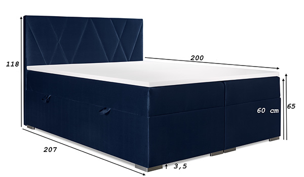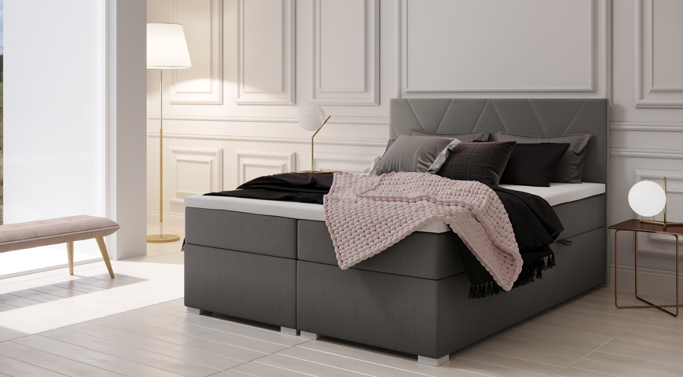 Das Bett Lira ist ein modernes Modell, das sich durch das originelle Design des Kopfteils auszeichnet. Dieses ist mit eleganten Steppnähten verziert, die sich zu einem „V“ formen und dem Gesamtbild eine subtile Dynamik und einen zeitgemäßen Charakter verleihen.