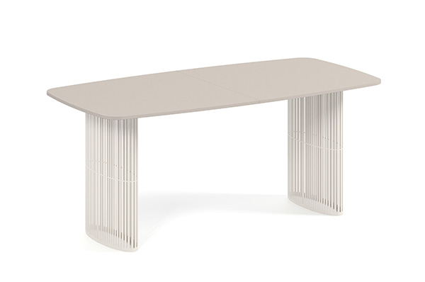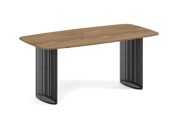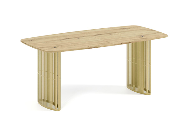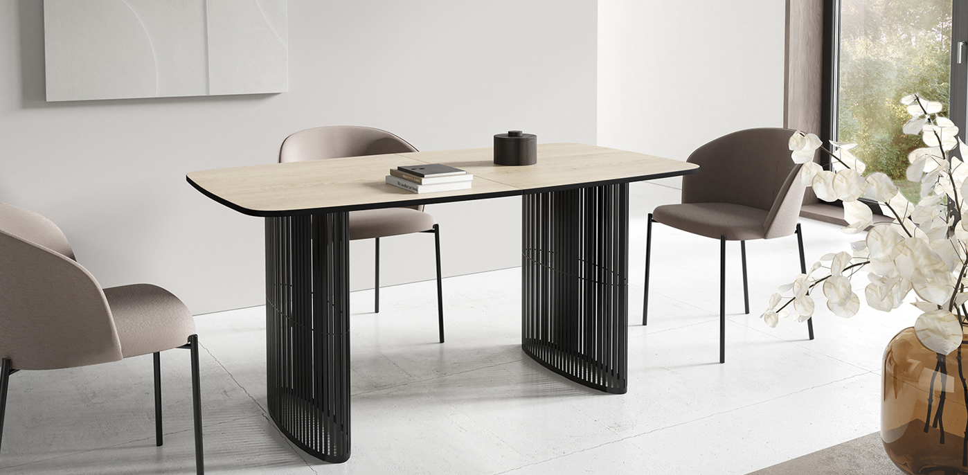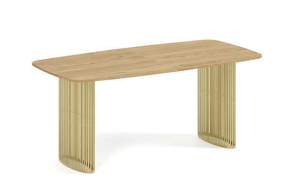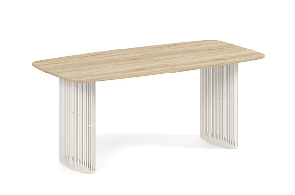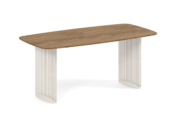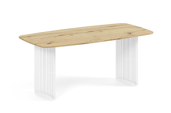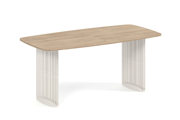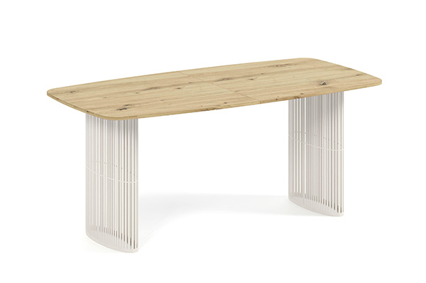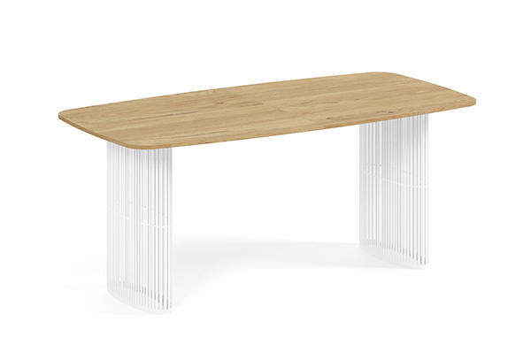 Der Alen-Tisch vereint auf elegante Weise modernes Design und Funktionalität. Seine ovale Tischplatte bietet viel Platz, während die beiden filigranen, geschwungenen Beine für Leichtigkeit und Stabilität sorgen. Dank seines zeitlosen Charakters passt er perfekt in private Wohnräume und Geschäftsräume.