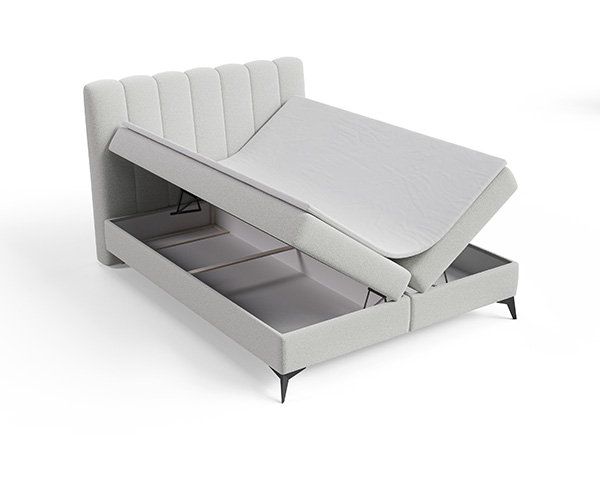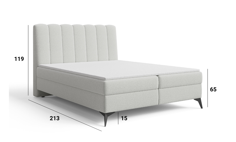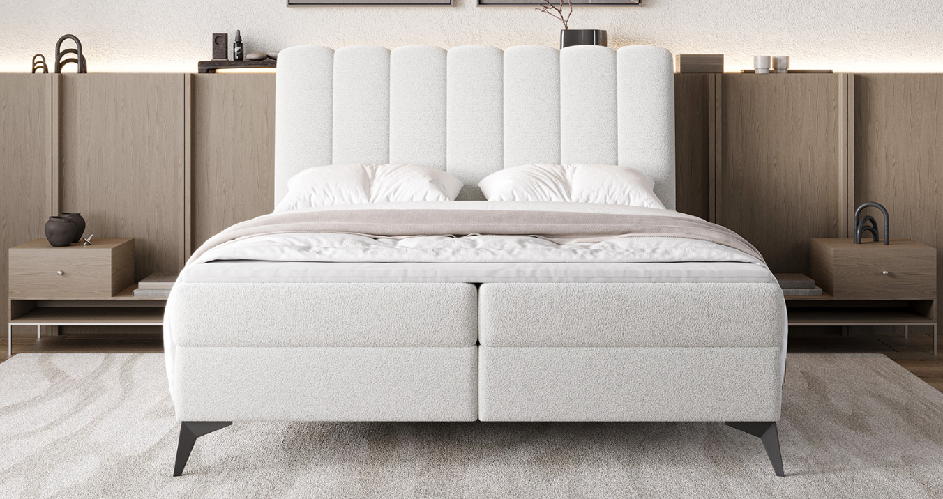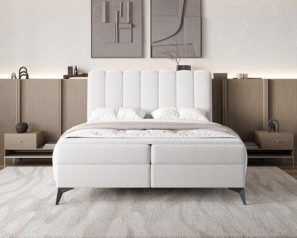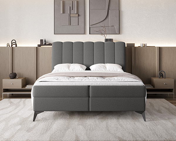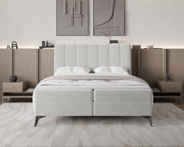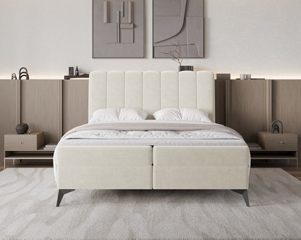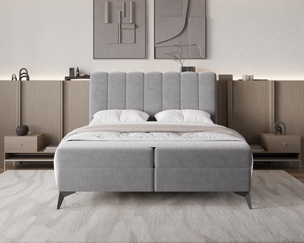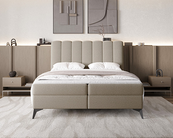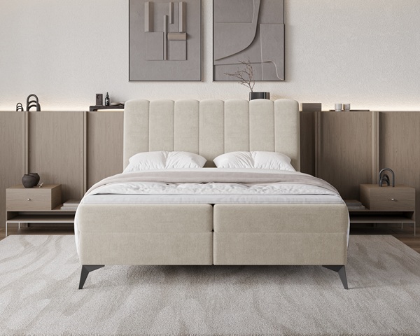 Das Boxspringbett Velutto ist eine moderne Interpretation von Komfort im Soft-Modern-Stil. Das weich abgerundete Kopfteil mit vertikalen Steppnähten verleiht der Form Leichtigkeit und Harmonie, während die gepolsterte Konstruktion den gemütlichen und eleganten Charakter des Möbels unterstreicht. Velutto eignet sich hervorragend für Schlafzimmer, die minimalistisches Design mit einem hohen Maß an Komfort verbinden.