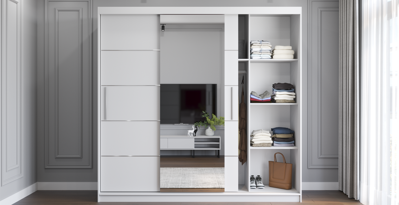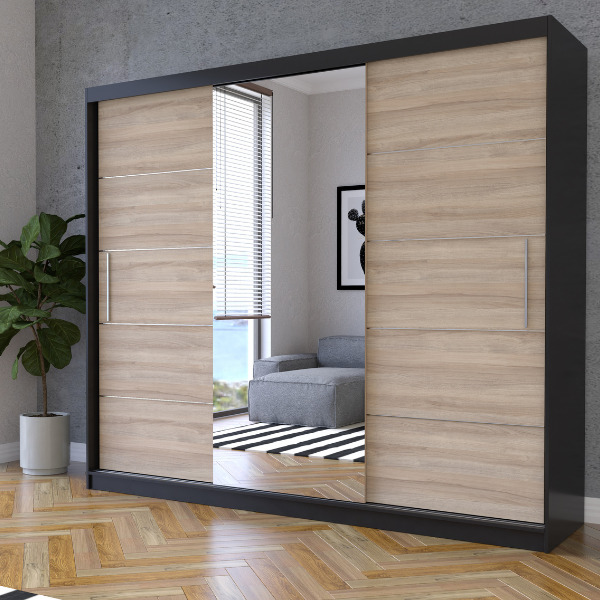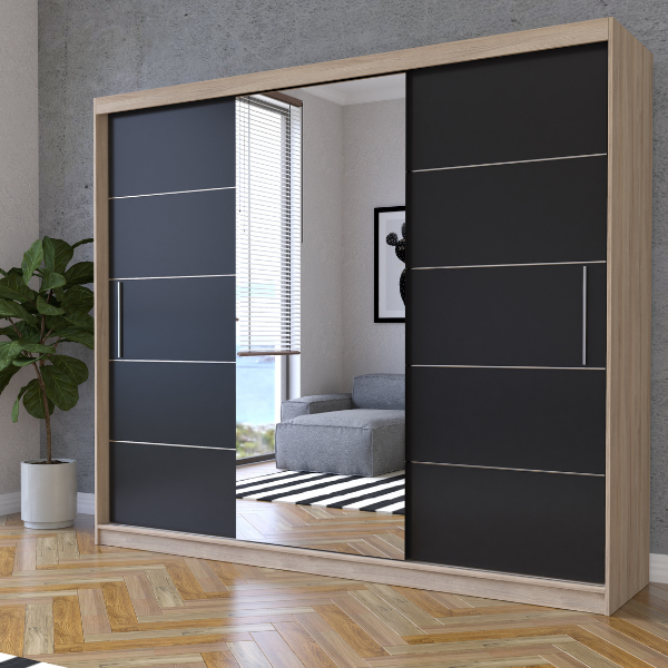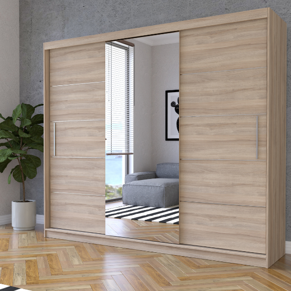 Dieser elegante Schwebetürenschrank mit integriertem Spiegel verbindet modernes Design mit hoher Funktionalität. Er bietet viel Stauraum dank praktischer Einlegeböden und einer stabilen Kleiderstange und ist ideal für Schlafzimmer, Ankleidezimmer oder Flur. Der große Spiegel vergrößert optisch den Raum und sorgt für mehr Helligkeit. Der Kleiderschrank ist in vielen attraktiven Farbvarianten erhältlich und lässt sich perfekt an verschiedene Einrichtungsstile anpassen. Hochwertige Verarbeitung, langlebige Materialien und durchdachte Innenaufteilung machen diesen Schrank zur perfekten Lösung für stilvolle Ordnung.
