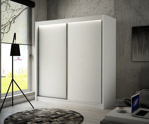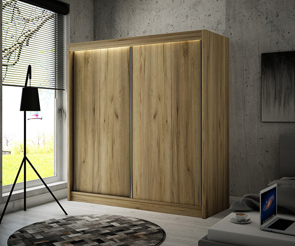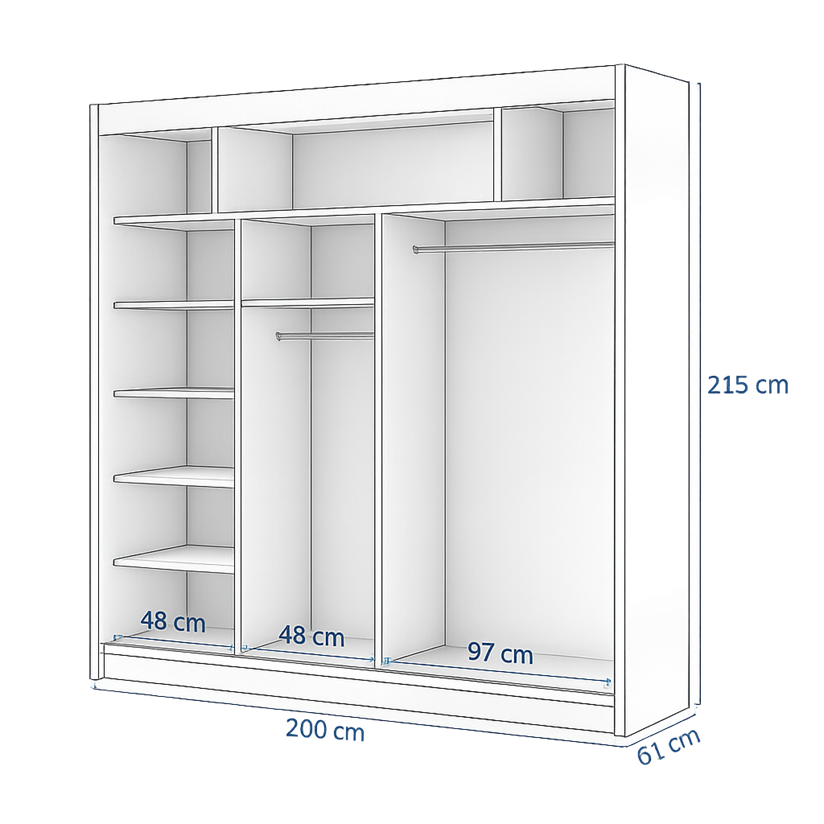 Der Kleiderschrank Bagro verbindet moderne Ästhetik mit Funktionalität, und die beiden Schiebetüren sparen Platz und erleichtern den Zugang. Der Innenraum mit Regalböden und einer Kleiderstange ermöglicht eine bequeme Ordnung von Kleidung und Accessoires. Leichtgängige Führungsschienen und eine solide Verarbeitung garantieren hohen Nutzungskomfort.