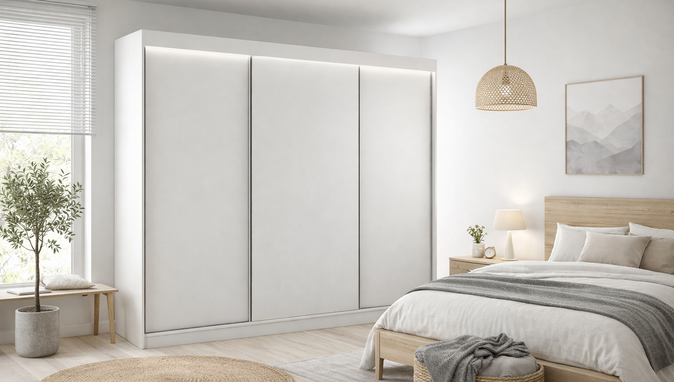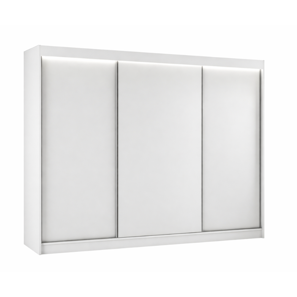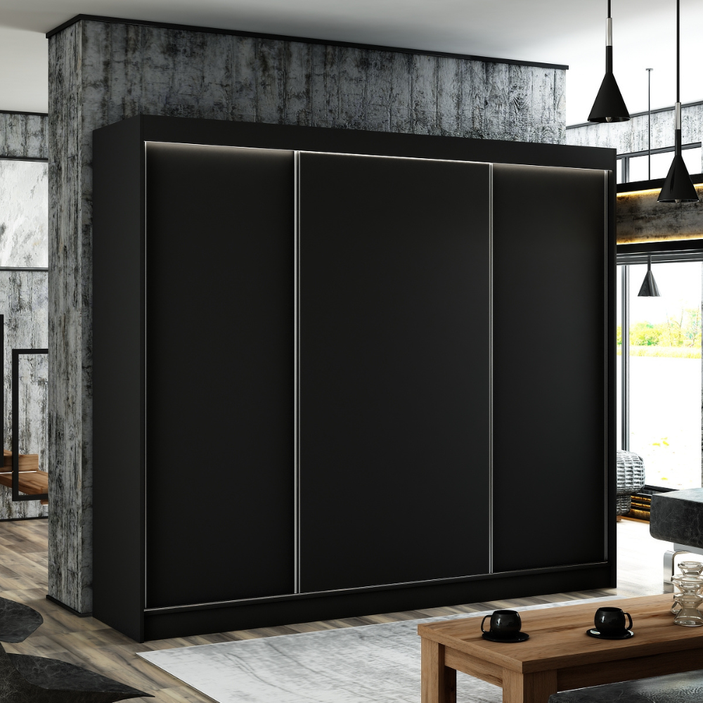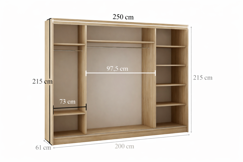 Der Kleiderschrank Bagro vereint modernes Design mit Funktionalität. Drei Schiebetüren sparen Platz und ermöglichen einen bequemen Zugriff. Der Innenraum mit Einlegeböden und drei Kleiderstangen bietet optimale Organisation für Kleidung und Accessoires. Leichtgängige Führungen und eine robuste Konstruktion garantieren hohen Bedienkomfort.