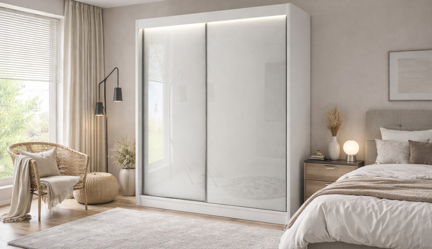 Der Kleiderschrank PIK verbindet modernen Stil mit hoher Funktionalität: Beide Schiebetüren aus Lacobel-Glas verleihen dem Innenraum einen eleganten Glanz. Die zwei Schiebeflügel sparen Platz und ermöglichen einen bequemen Zugang zum gesamten Inhalt. Im Inneren befinden sich Einlegeböden und eine Kleiderstange, während leise laufende Schienen und eine solide Verarbeitung den Nutzungskomfort gewährleisten.