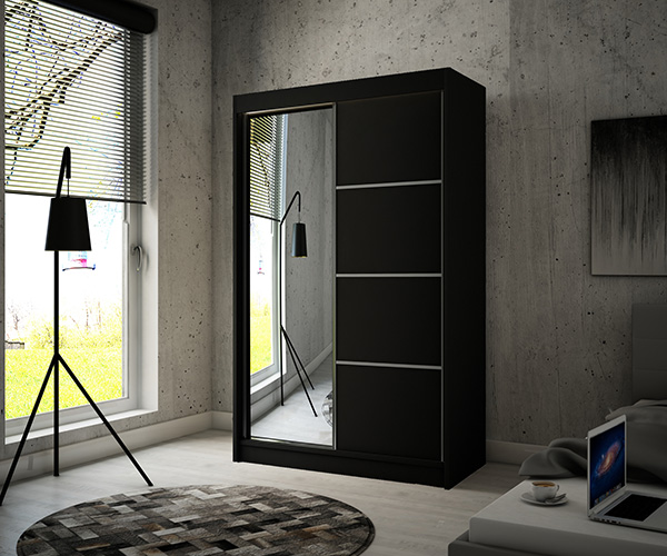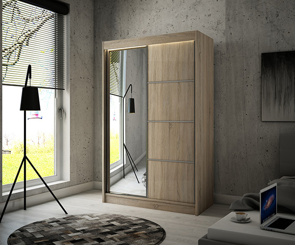 Der Kleiderschrank Peko vereint modernes Design mit Funktionalität: Eine verspiegelte Front lässt den Raum optisch größer wirken, während die andere mit markanten Sprossen verziert ist. Zwei Schiebetüren sparen Platz und ermöglichen einen bequemen Zugriff. Regalböden und eine Kleiderstange sorgen für Ordnung, und leichtgängige Schienen sowie eine robuste Verarbeitung garantieren hohen Tragekomfort.