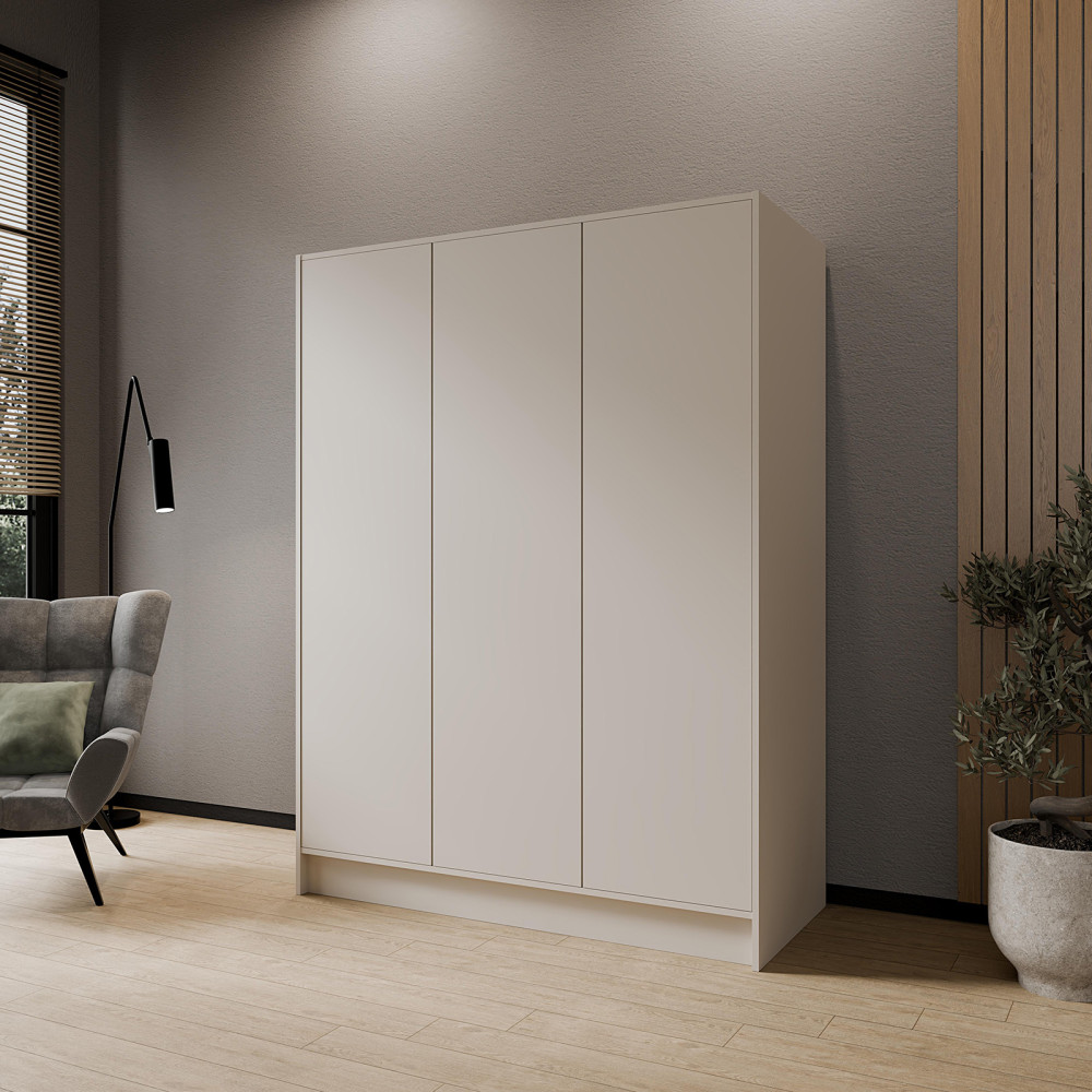 Der Kleiderschrank Giva besticht durch sein minimalistisches und vielseitiges Design mit glatten, einheitlichen Fronten, das sich harmonisch in verschiedene Einrichtungsstile einfügt. Der Verzicht auf Griffe unterstreicht den modernen Charakter des Möbels, während das TIP-ON-System ein müheloses Öffnen der Türen durch leichtes Drücken ermöglicht und so für Komfort und ein klares, ästhetisch ansprechendes Design sorgt.