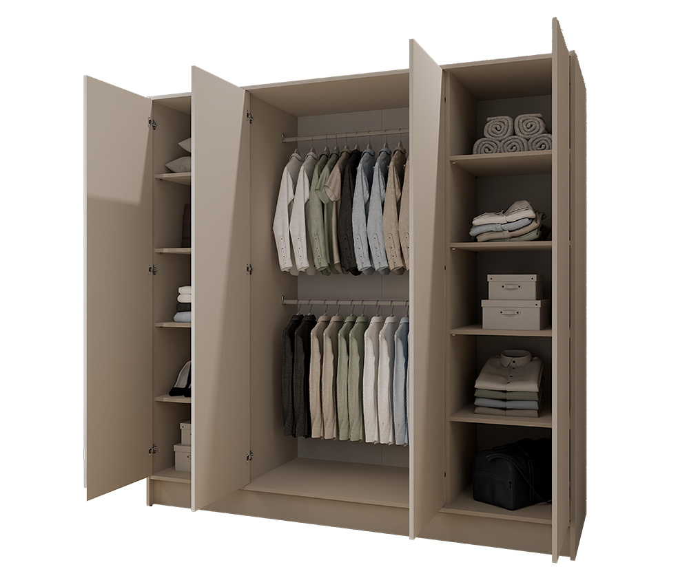 Der Kleiderschrank Giva besticht durch sein minimalistisches und vielseitiges Design mit glatten, einheitlichen Fronten, das sich harmonisch in verschiedene Einrichtungsstile einfügt. Der Verzicht auf Griffe unterstreicht den modernen Charakter des Möbels, während das TIP-ON-System ein müheloses Öffnen der Türen durch leichtes Drücken ermöglicht und so für Komfort und ein klares, ästhetisch ansprechendes Design sorgt.