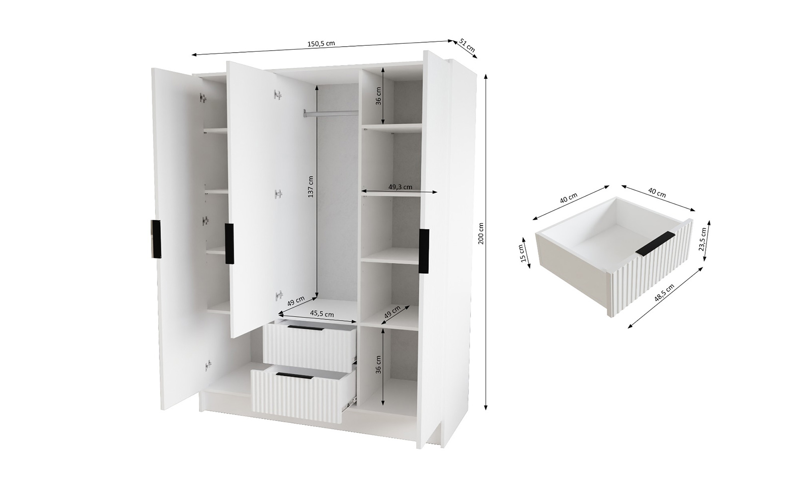 Im Inneren befindet sich eine praktische Anordnung von Einlegeböden, eine Kleiderstange sowie geräumige Schubladen, die die Organisation erleichtern, während die solide Verarbeitung einen hohen Nutzungskomfort im Alltag garantiert.