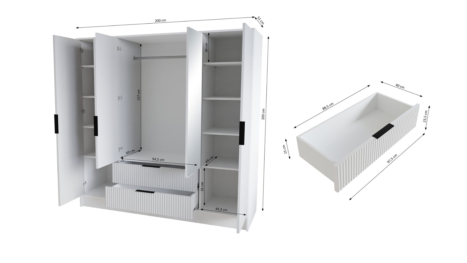 Im Inneren befindet sich eine praktische Anordnung von Einlegeböden, eine Kleiderstange sowie geräumige Schubladen, die die Organisation erleichtern, während die solide Verarbeitung einen hohen Nutzungskomfort im Alltag garantiert.