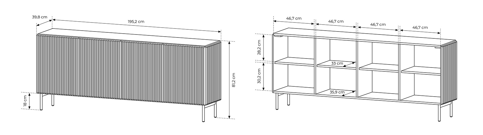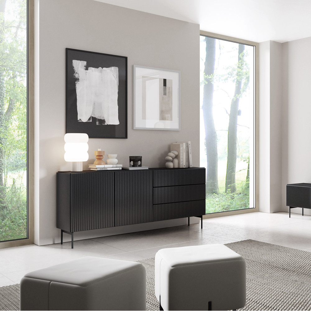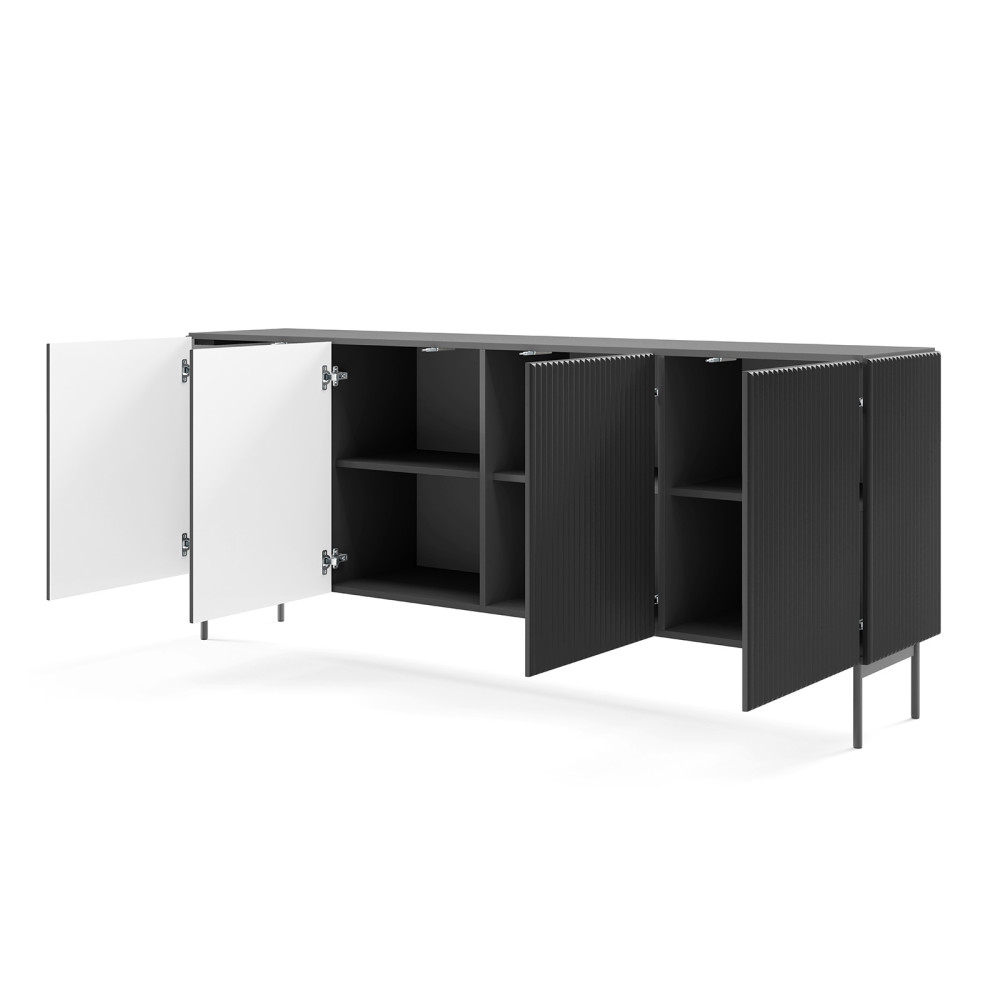Die breite Kommode mit vier Türpaaren bietet ein geräumiges Innenleben mit Einlegeböden, die eine funktionale Anordnung von Haushaltsgegenständen ermöglichen. Geriffelte Fronten und schlanke Metallfüße verleihen dem Raum eine elegante, minimalistische Note. Das grifflose Push-to-Open-System unterstreicht den modernen Charakter des Möbelstücks.