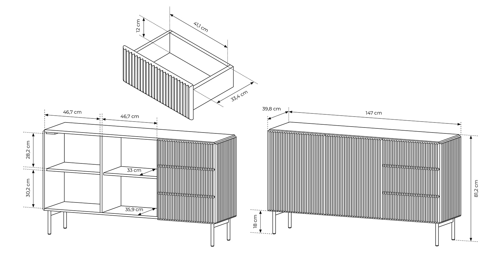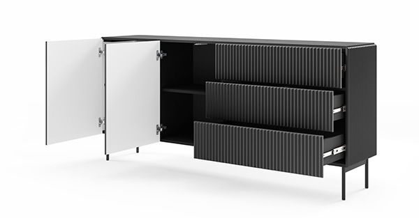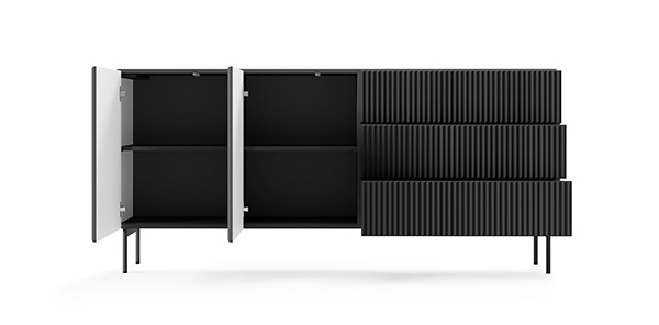 Kommode 147 cm, Schwarz, 2-türig mit Schubladen, Lamellen – MAVI 2D3S