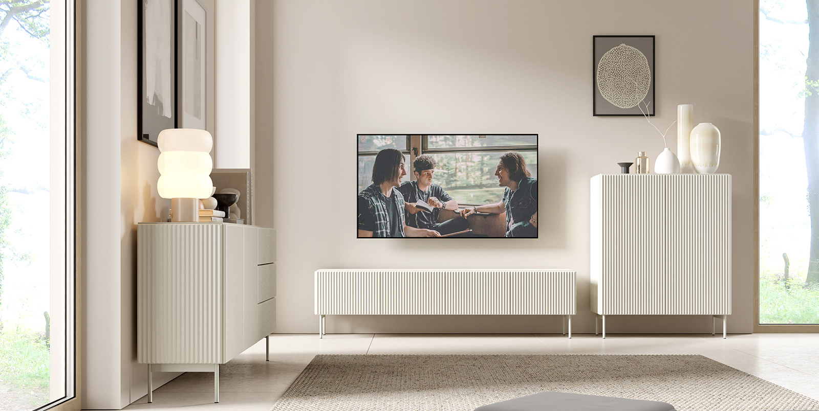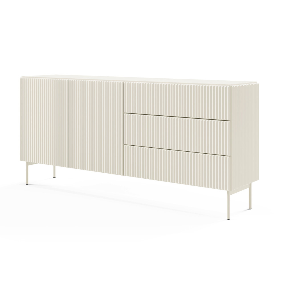 Die Kommode mit zwei Türpaaren und drei zentral angeordneten Schubladen ermöglicht eine komfortable Organisation verschiedener Gegenstandskategorien – von Dokumenten bis hin zu Textilien. Der Vollauszug der Schubladen gewährleistet einen einfachen Zugang zum Inhalt. Geriffelte Fronten, erhältlich in zwei Farbvarianten, sowie ein Metallgestell verleihen dem Möbelstück einen ausdrucksstarken, zeitgemäßen Stil.