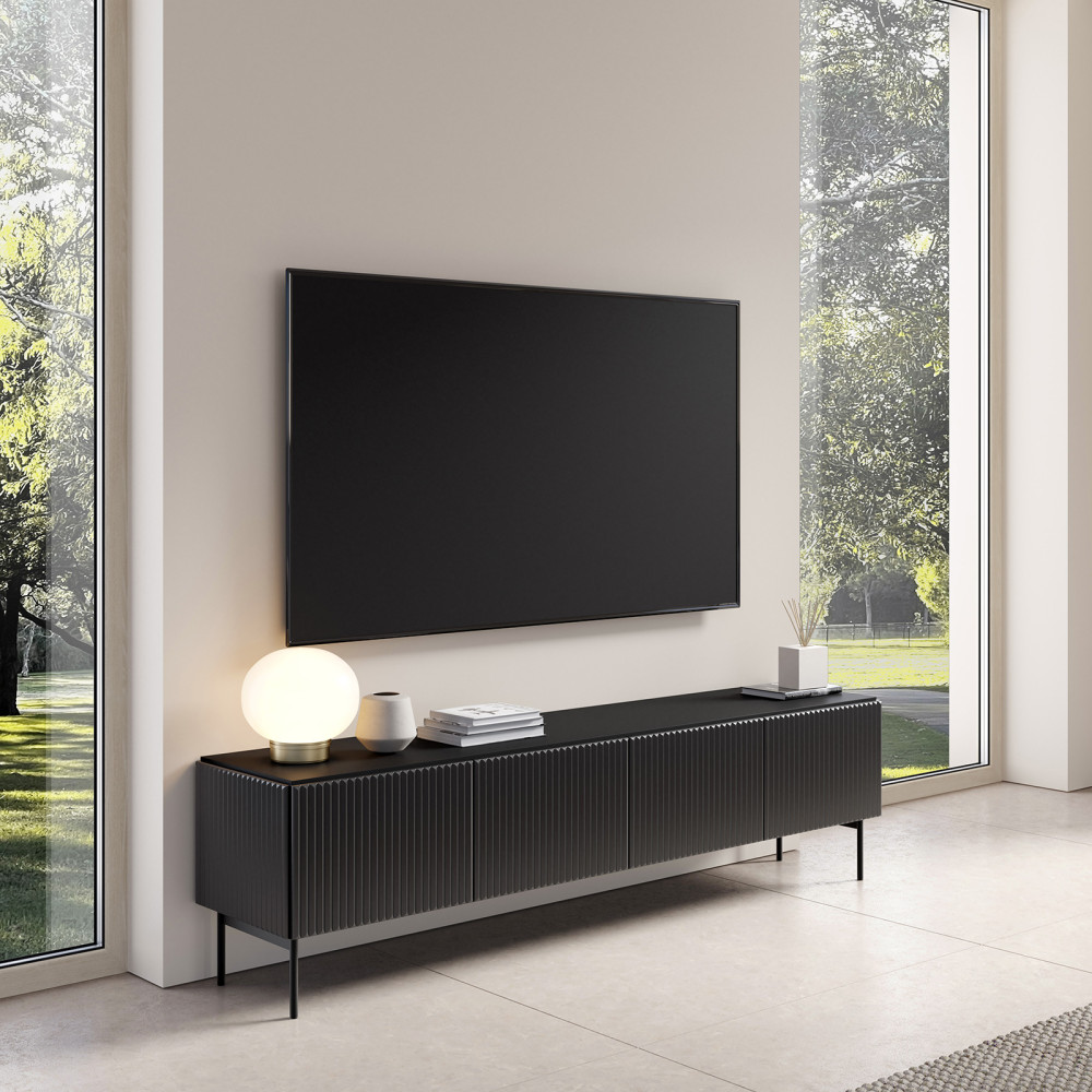Kabinett RTV MAVI mit einer Länge von 195 cm ist mit vier Türfronten ausgestattet, hinter denen sich Platz für RTV-Geräte sowie weiteres Wohnzubehör befindet. Die stabile Konstruktion, das Metallgestell und die dezente Farbgebung – erhältlich in zwei Farbvarianten mit geriffelten Details – unterstreichen das moderne, elegante Erscheinungsbild des Möbelstücks.