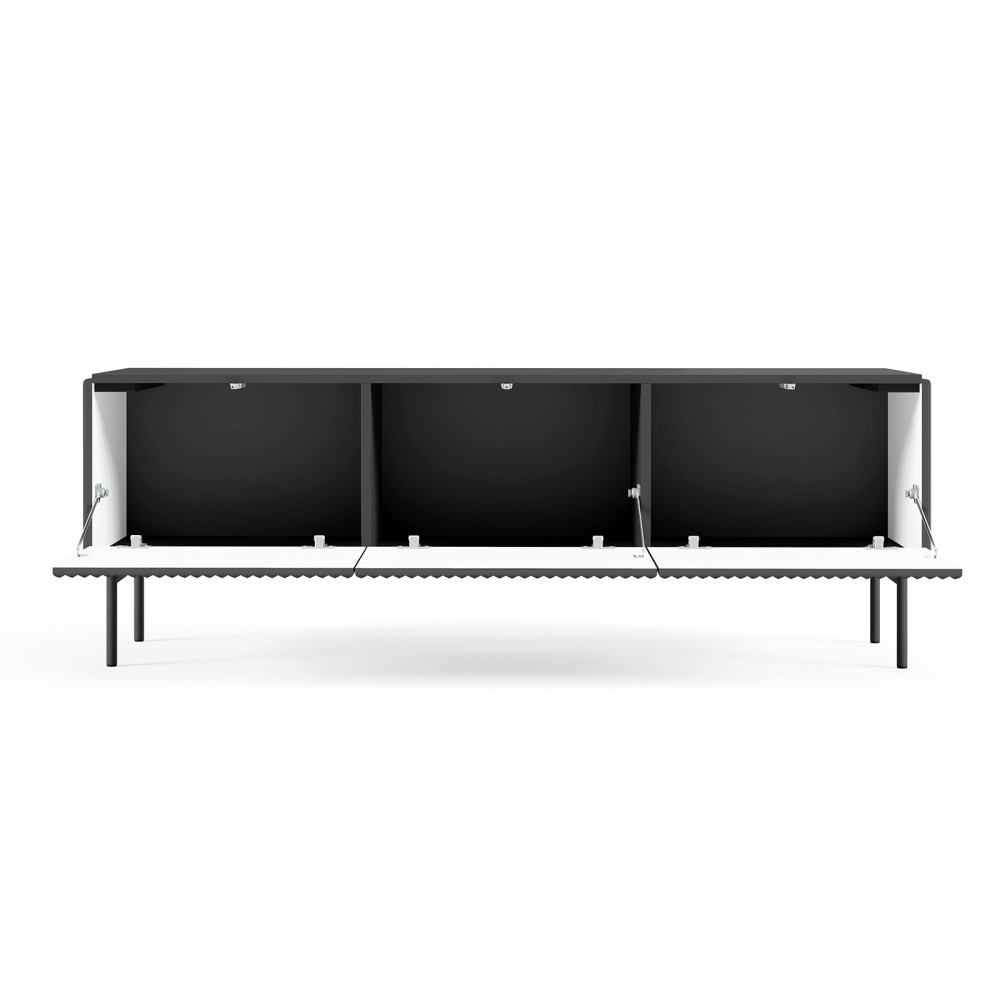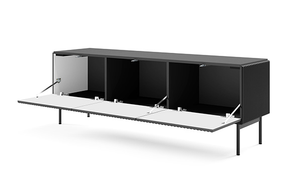 Kabinett RTV 3D 147 mit drei Türen wurde für die Aufbewahrung von Multimedia-Geräten und Zubehör konzipiert. Die schlichte, geometrische Form, geriffelte Fronten sowie die kaschmirfarbene Ausführung in Kombination mit einem Metallgestell sorgen dafür, dass sich das Möbelstück perfekt in moderne und elegante Innenräume einfügt
