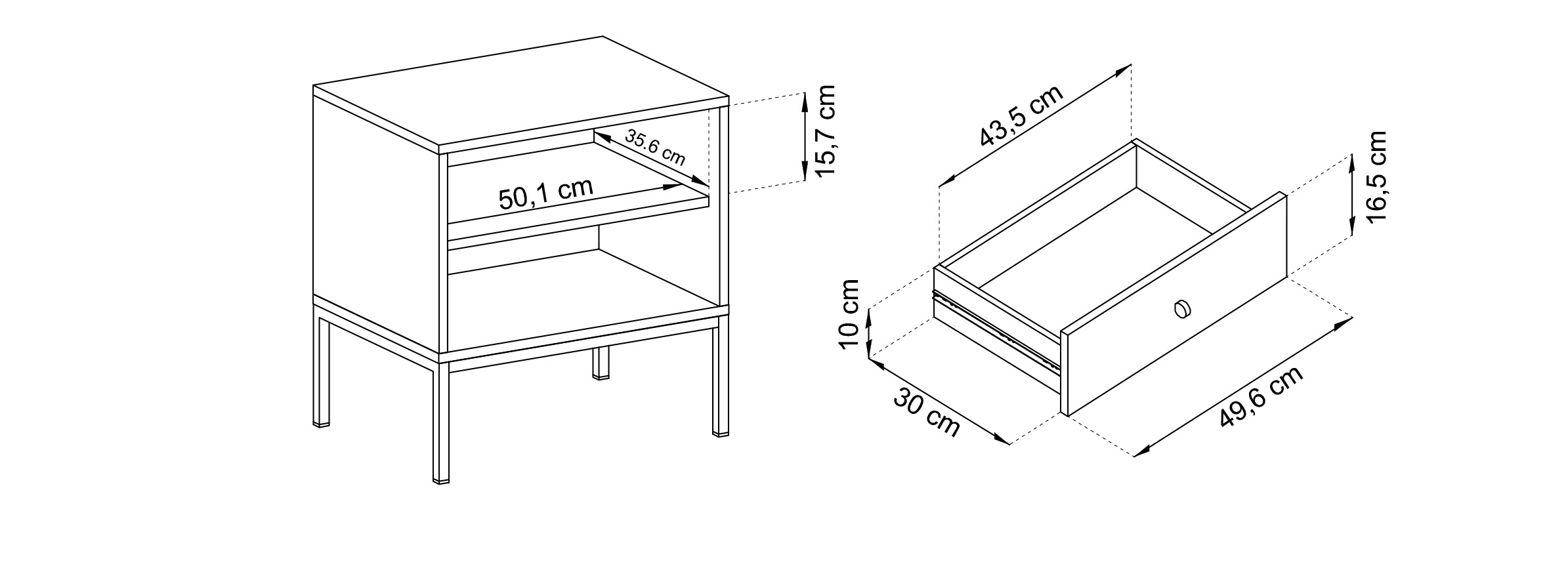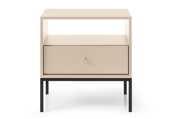 Der Nachttisch MS54 verfügt über eine geräumige Schublade sowie eine Ablage für die wichtigsten Dinge des täglichen Gebrauchs. Der Korpus des Möbelstücks steht auf einem geometrischen Metallgestell mit hohen Füßen. Das farbige Dekor sowie der zarte, goldfarbene Griff unterstreichen den Charakter des Interieurs und machen das Möbelstück zu einem außergewöhnlichen, designorientierten Blickfang.
