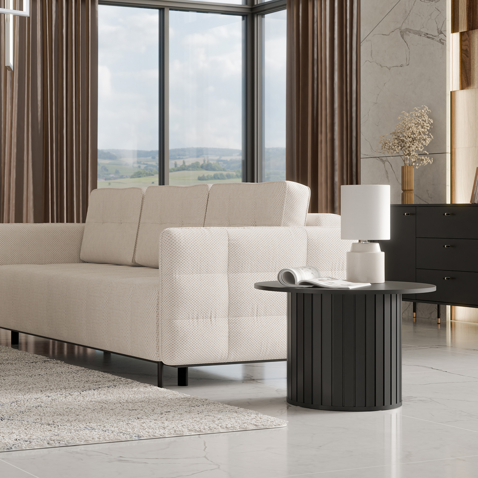 Zum System gehören Kommoden, eine Vitrine, ein TV-Lowboard, ein Couchtisch, ein Wohnzimmertisch sowie ein Esstisch, wodurch sich der Raum flexibel nach eigenen Bedürfnissen gestalten lässt. Die Kollektion ist in zwei modischen Farbvarianten erhältlich: Kaschmir und klassisches Schwarz, sodass sie sich sowohl an helle als auch an ausdrucksstärkere Innenräume mühelos anpassen lässt.