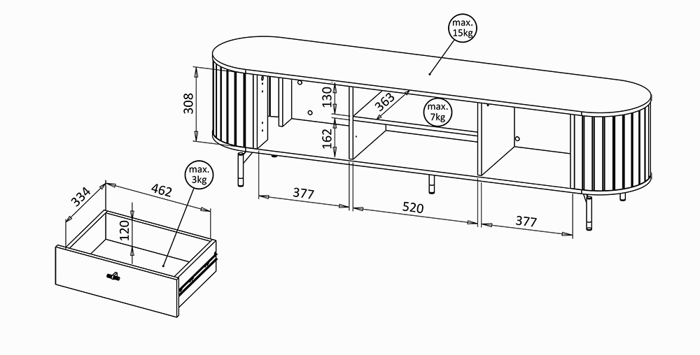 Das Lowboard ist mit zwei geschlossenen Schränken, einer praktischen Schublade sowie einem offenen Fach ausgestattet, das sich ideal für RTV-Geräte, einen Receiver oder eine Konsole eignet. Diese Aufteilung sorgt für eine komfortable Organisation und hilft, Ordnung im Multimedia-Bereich zu halten.