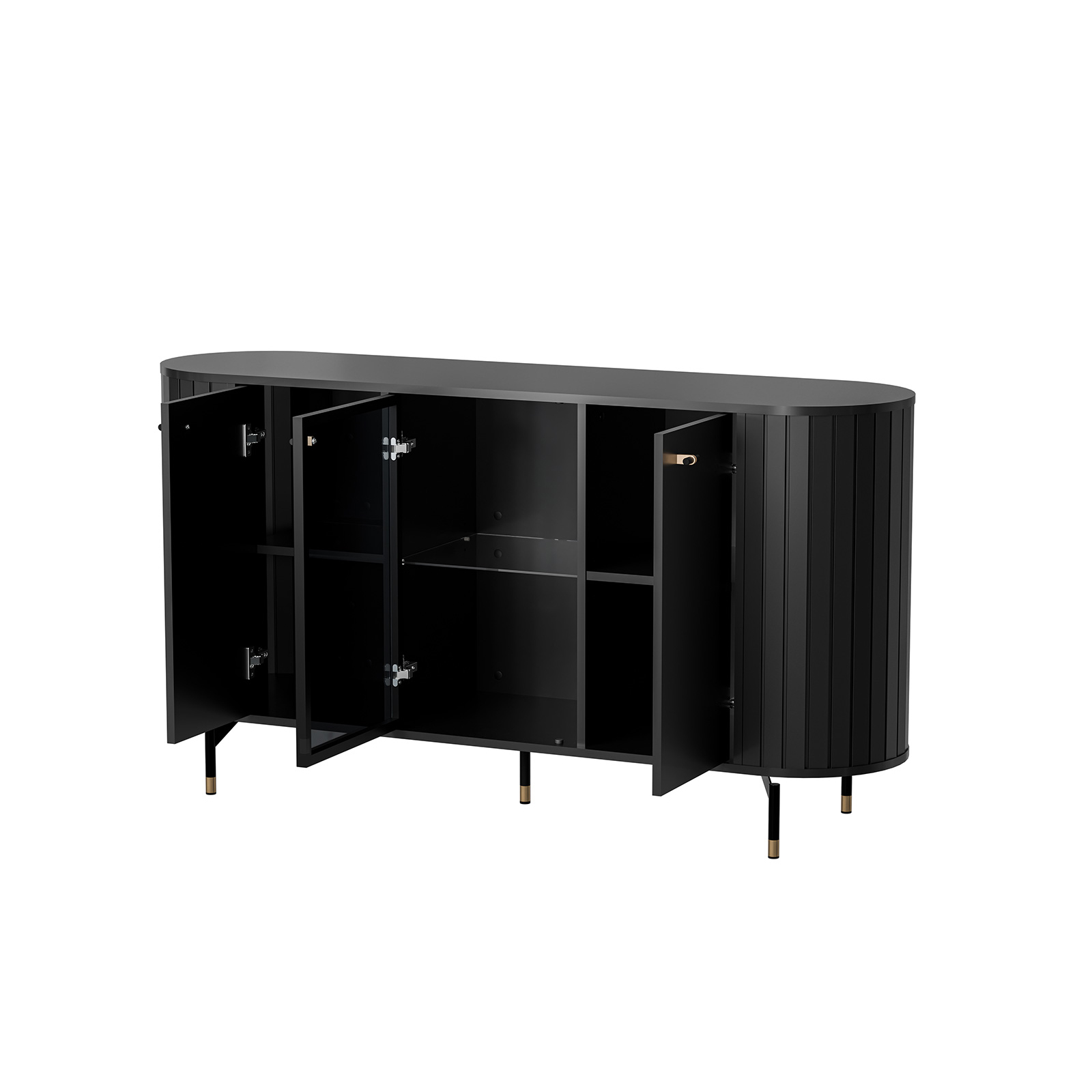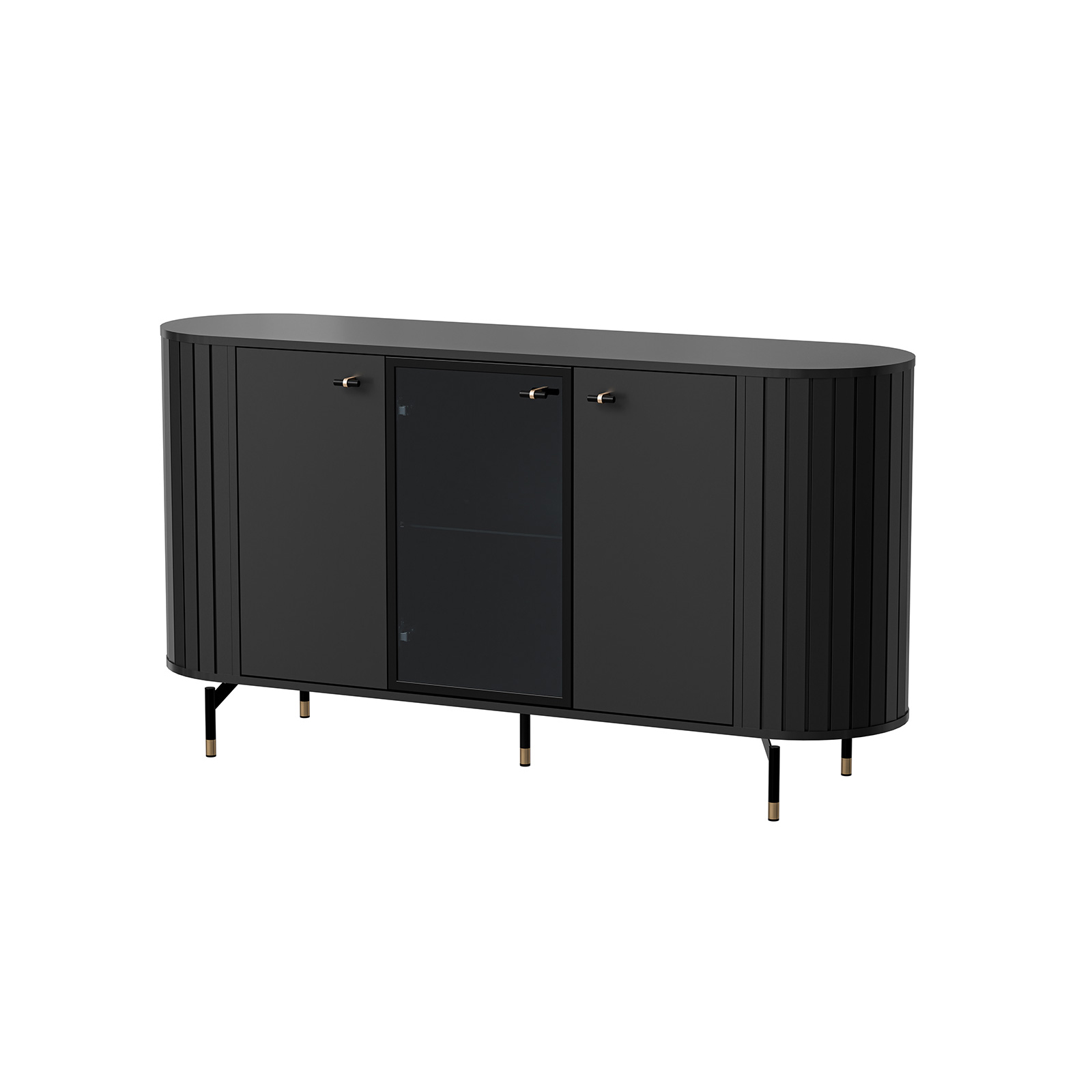 Die Kommode Zoeva ZA3 verbindet modernes Design mit Funktionalität. Die abgerundete Form und die Lamellenseiten verleihen ihr einen eleganten, dekorativen Charakter. Sie verfügt über drei Türpaare, darunter eine verglaste Front zur stilvollen Präsentation von Dekorationen, während die übrigen Schränke praktischen Stauraum bieten.