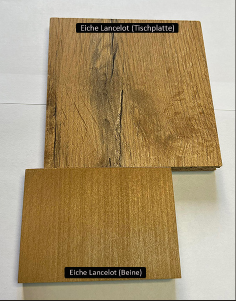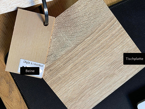 Ja, es wird einen Unterschied geben. Die Tischplatte ist mit Kunststoff laminiert und weist eine wiederholbare Imitation von Ästen und Einschlüssen in der Struktur auf. Die Beine aus Buchenholz sind gleichmäßiger und weisen kleine, natürliche, gesunde Äste auf, der Farbton ist jedoch auf die entsprechende Laminat-Arbeitsplatte in derselben Farbe abgestimmt.