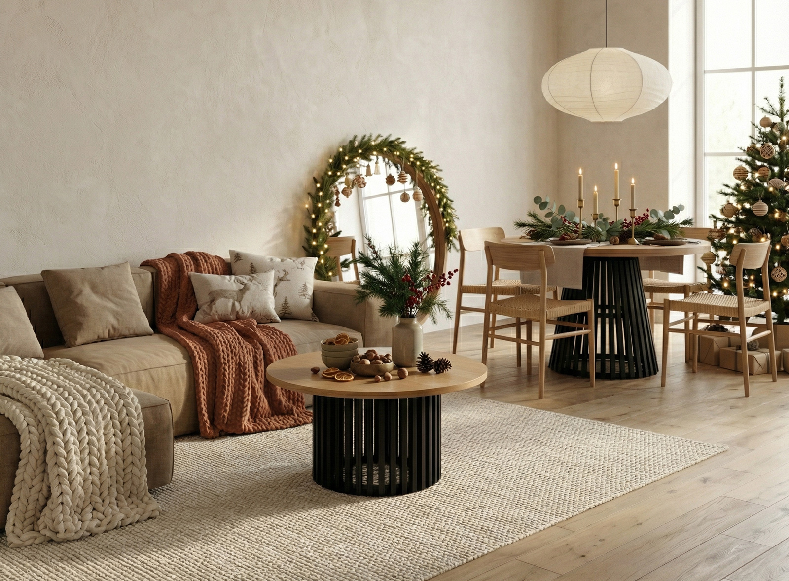 Der Couchtisch rundet das Gesamtbild ab – er ist zugleich praktisch und dekorativ. Hier stehen die Tassen mit heißer Schokolade, der Teller mit Lebkuchen oder das weihnachtliche Gesteck aus Zweigen, Kerzen und Kugeln. Ein schlichter, stabiler Tisch mit leichter Form wirkt nicht überladen und seine Platte wird zur idealen Bühne für kleine, festliche Arrangements. Auf dem Tisch lässt sich eine kleine Weihnachtskomposition arrangieren: ein Tablett mit einigen Kerzen, Tannenzweigen, Zapfen und kleinen Dekorationen, die farblich auf den Weihnachtsbaum und die Kissen auf dem Sofa abgestimmt sind.