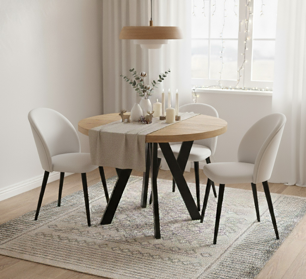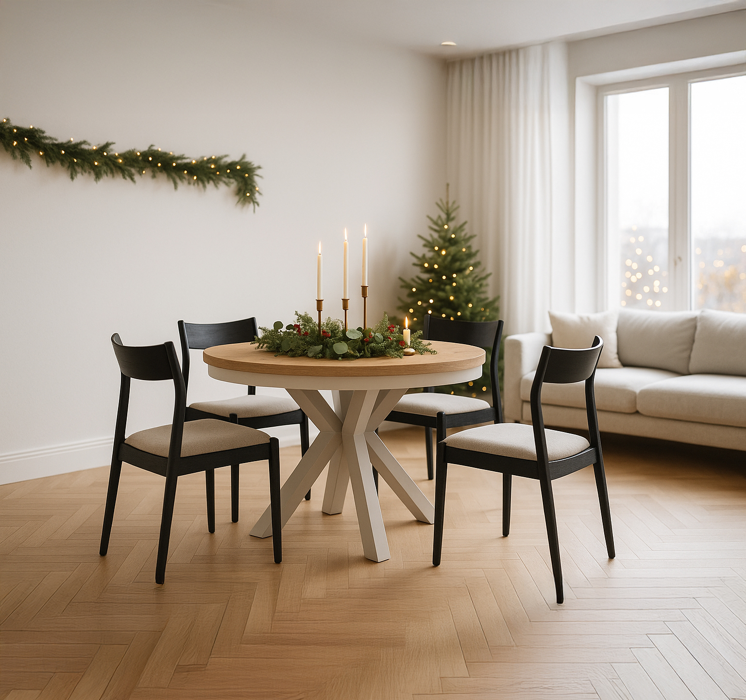 Stühle im weihnachtlichen Esszimmer sind genauso wichtig wie der Tisch selbst – von ihrem Komfort hängt ab, ob die Gäste gerne viele Stunden daran verbringen. Modelle mit weichem, gepolstertem Sitz und sanft geformter Rückenlehne sorgen für Bequemlichkeit beim festlichen Abendessen, aber auch beim morgendlichen Kaffee an den Weihnachtstagen. Helle Polsterungen und schlanke, hölzerne Beine verleihen der Einrichtung Leichtigkeit, ohne den Raum zu überladen, und harmonieren wunderbar mit natürlichen Dekorationen: dem Grün des Weihnachtsbaums, Zweigen auf der Kommode oder dem warmen Kerzenlicht. Solche Stühle bilden einen neutralen, eleganten Hintergrund, vor dem festliches Geschirr und Dekorationen die Hauptrolle spielen können.