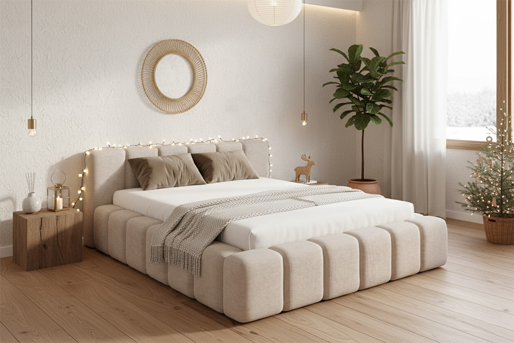 Das Schlafzimmer ist ein Ort der Ruhe nach einem intensiven Weihnachtstag – deshalb lohnt es sich, hier auf eine sanfte, behagliche Gestaltung zu achten. Ein Bett mit bequemem Matratze und weichem Kopfteil bildet das Zentrum des Raumes und sorgt für ein Gefühl von Komfort. Neutrale Bettwäsche kann als Basis dienen, zu der für die Feiertage ein warmer Plaid, eine Tagesdecke mit markanter Struktur und einige dekorative Kissen hinzugefügt werden. Sanfte Beleuchtung – Nachttischlampen, Wandleuchten oder eine zarte Lichterkette – verleiht dem Schlafzimmer eine stimmungsvolle Atmosphäre und lädt zum Entspannen ein.