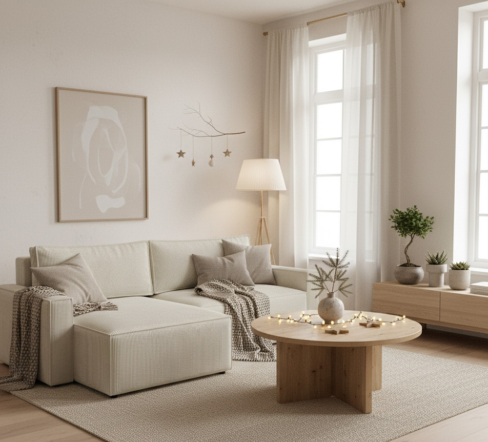 Die weihnachtliche Atmosphäre im Zuhause beginnt im Wohnzimmer. Hier steht der Weihnachtsbaum, hier entspannen wir nach einem langen Tag und treffen uns mit unseren Liebsten. Deshalb lohnt es sich, auf ein stimmiges Gesamtbild zu achten – von der Wahl des Ecksofas oder Sofas über den Couchtisch bis hin zu den Dekorationen auf Regalen und Kommoden. Der Weihnachtsbaum kann den zentralen Blickfang im Wohnzimmer bilden, idealerweise in der Nähe der gemütlichen Sitzgruppe.