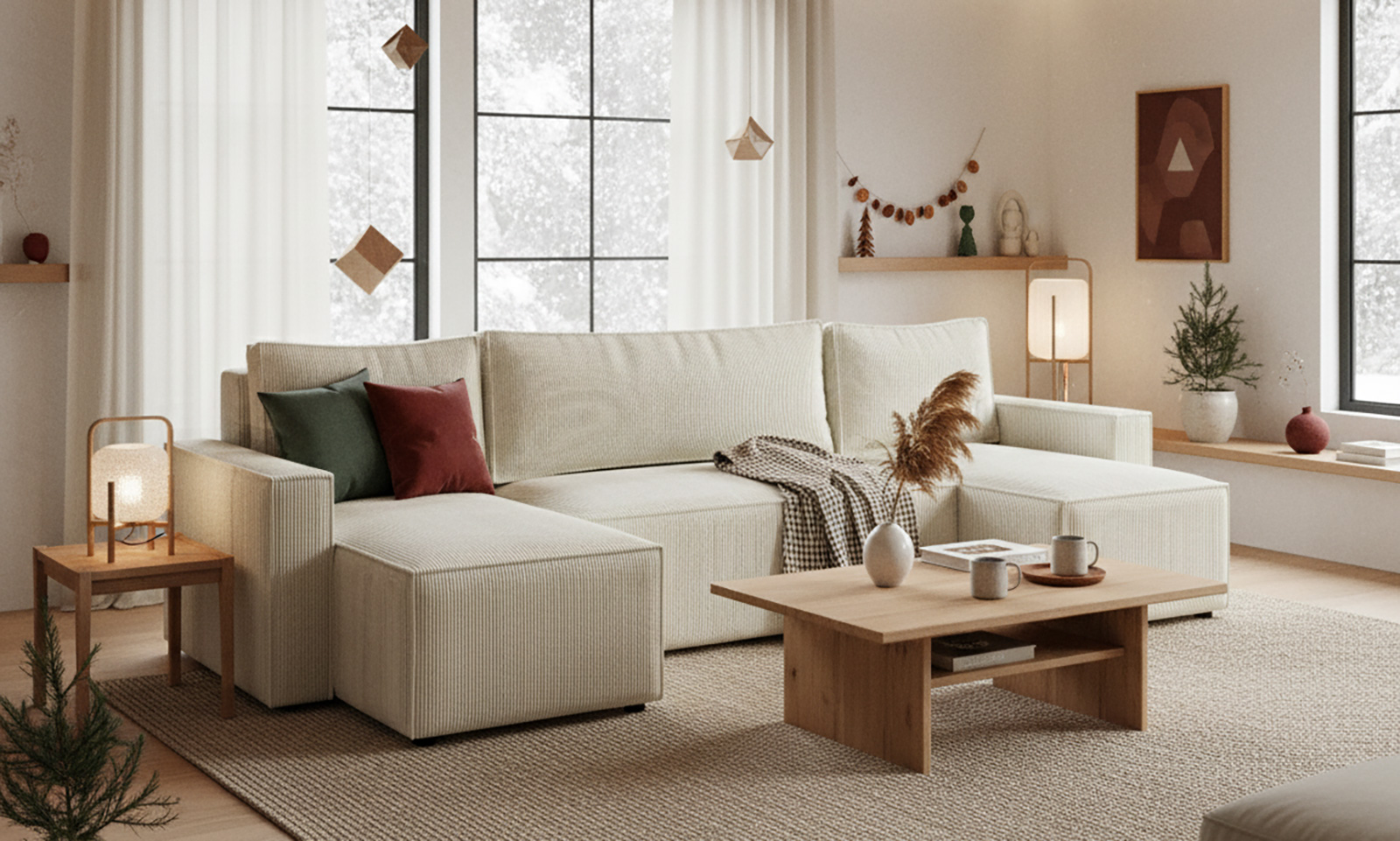 Das Ecksofa oder Sofa ist das Herz dieser Zone. Eine bequeme Wohnlandschaft in neutralen Farben ist die perfekte Bühne für weihnachtliche Textilien: Kissen mit Wintermotiven, warme Decken und Plaids. So lässt sich die Stimmung im Raum im Handumdrehen verändern – und nach den Feiertagen verstaut man einfach die Accessoires, damit das Wohnzimmer wieder einen universellen Charakter erhält. Dank der großen Auswahl an Polstergarnituren findet sich leicht ein Modell, das zur Raumgröße passt – von kompakten Sofas bis hin zu großzügigen Ecksofas, auf denen die ganze Familie Platz findet.