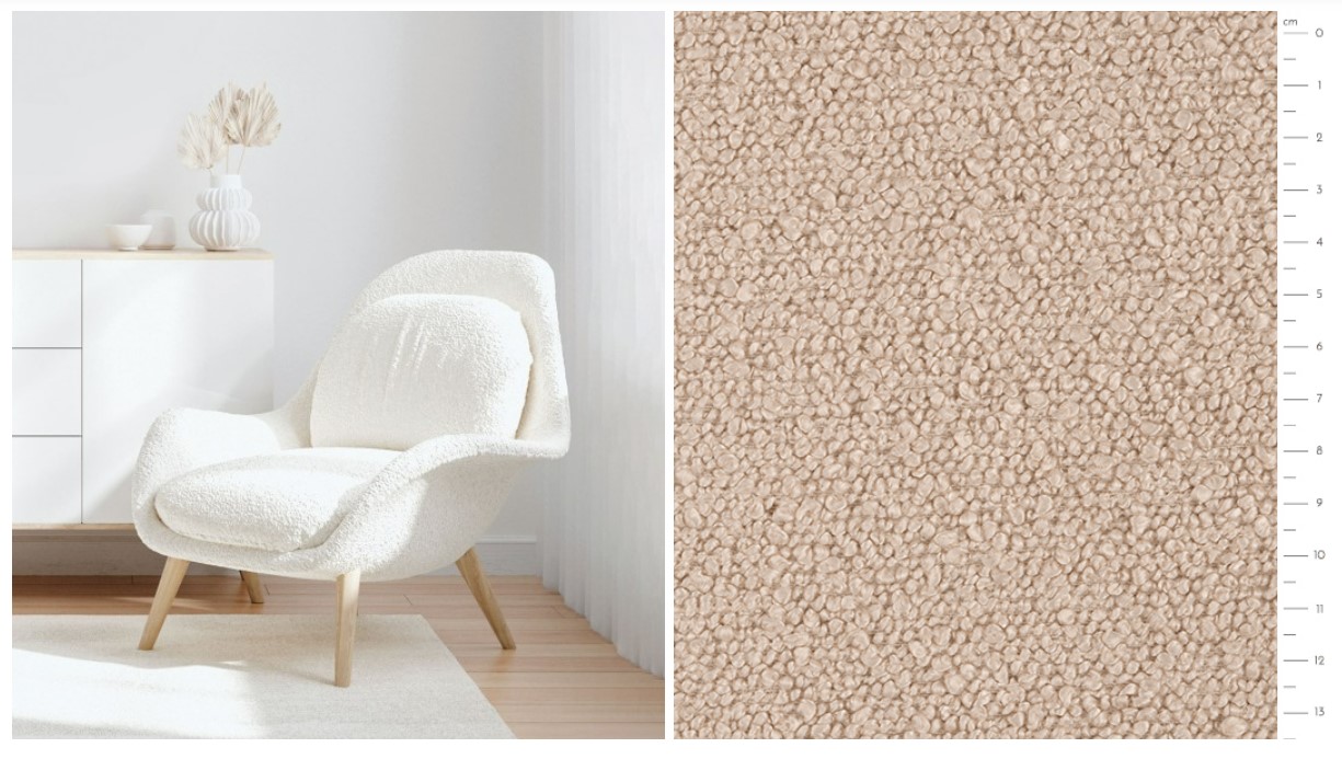 Abriamo ist ein strukturiertes Polstergewebe vom Bouclé-Typ (Schafwolle), das unbegrenzte Anwendungsmöglichkeiten bietet und Design mit außergewöhnlicher Funktionalität kombiniert. Es fühlt sich sehr angenehm an. Die Oberfläche des Materials erzeugt aufgrund des asymmetrischen, speziell gedrehten Garngewebes einen visuellen 3D-Effekt. Das Abriamo Bouclé-Polstergewebe wurde aus recyceltem Material hergestellt. Der Möbelstoff ist lichtbeständig, weshalb er sich ideal für gepolsterte Möbel, Sofas, Sessel, Betten, Poufs sowie Kissen und Überwürfe eignet.